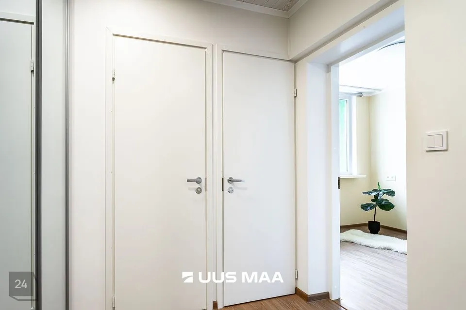 Korterisse sisenedes ootab ees avar esik, kust paremat kätt jääb väike magamistuba, seejärel eraldiasetsevad tualettruum, duširuum ja suur lükandustega garderoobikapp.