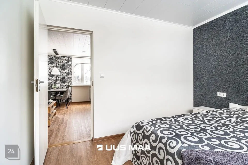 Esikust otse edasi pääseb elutuppa, kust paremat kätt jääb magamistuba ja vasakut kätt avatud köögiala.