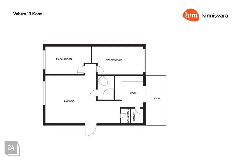 Korteri koosseisu kuulub avar esik koos eraldi panipaigaga; köök koos hoiuruumiga (köögist avaneb pääs rõdule); elutuba, 2 eraldi magamistuba; WC koos dušširuumiga.