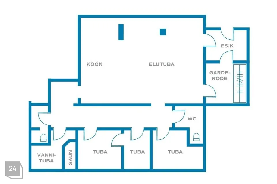 Avar 54m2 avatud köögiga elutuba suurte maastlaeni akendega on vaatega haljasalale, mis tagab meeldiva rohelise vaate hommikupäikse suunal. Haljasala on linnale kuuluv sihtosttarbetamaa. Korteril on suurele perele mugavalt kaks tualetti korteri erinevates otstes. Kolm eraldi paiknevat magamistuba ja vannituba paiknevad suunaga maja teisele küljele õhtu päikse suunal. Dušširuumis on ka elektrisaun sissetõstetud boksina.