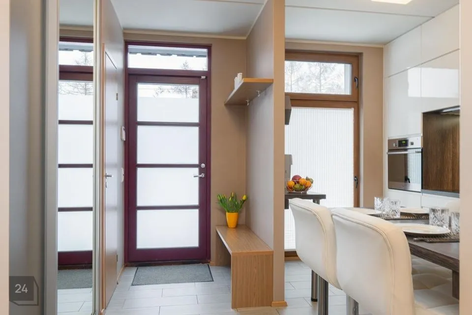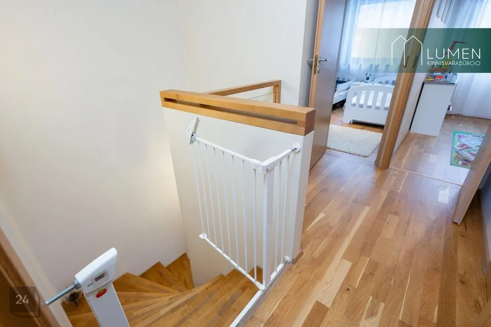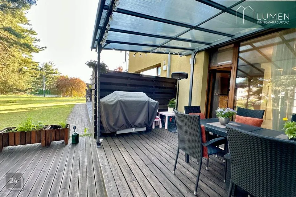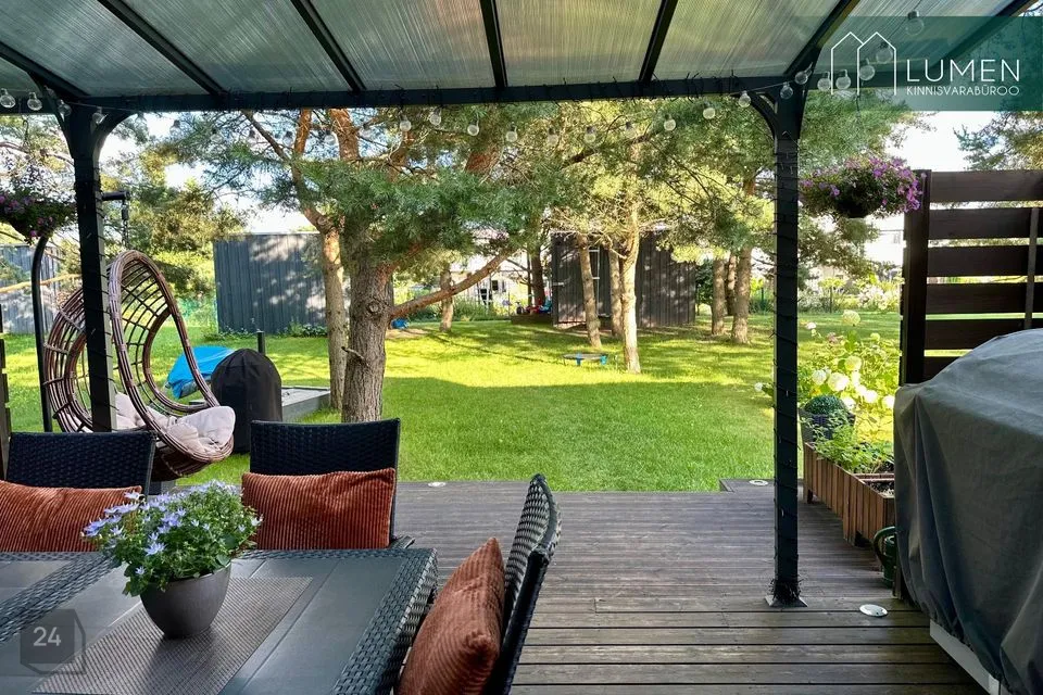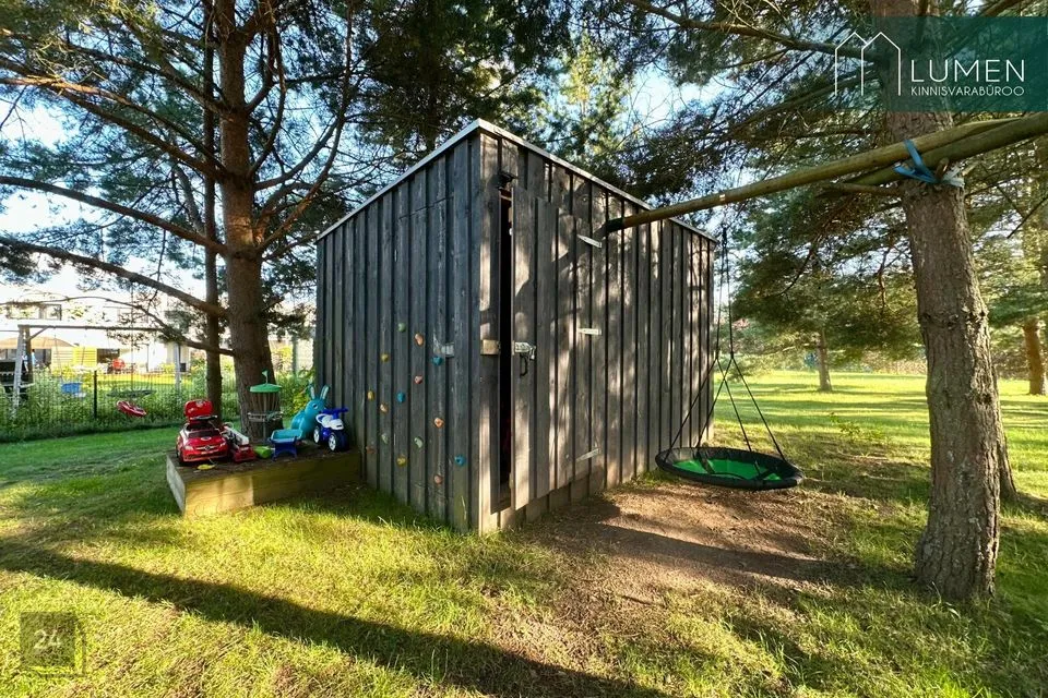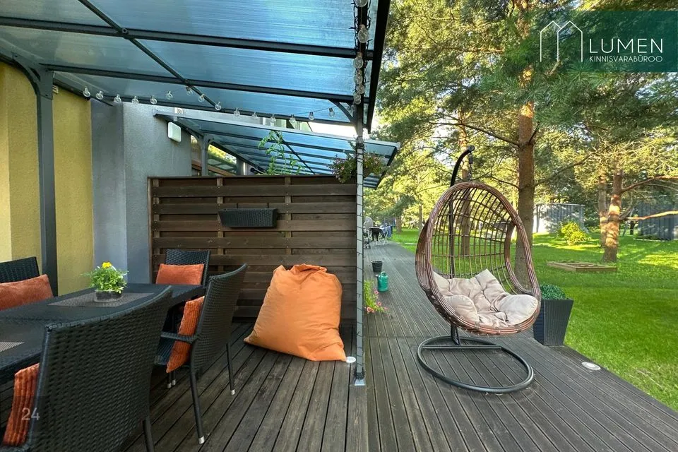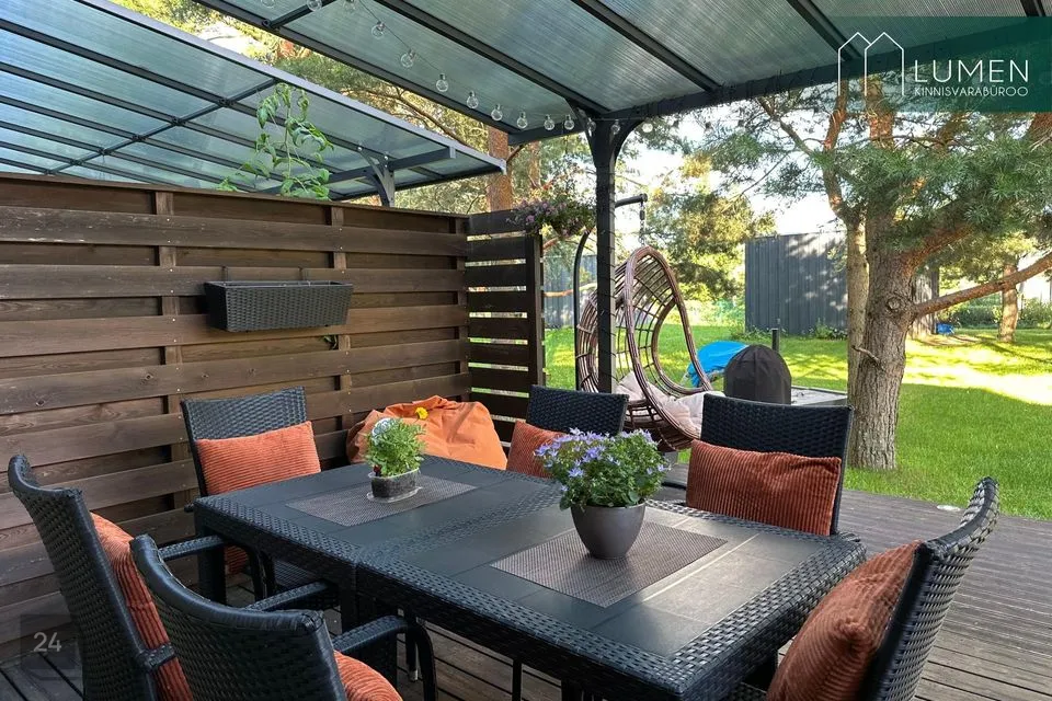 Väga läbimõeldud ja praktiline planeering. Selle valgusküllase kodu esimesel korrusel on esik koos mahuka garderoobikapiga, köök, tualett, tehnoruum, elutuba, panipaik/pesupesemise ruum ning elutoast pääseb maja taha 23m² suurusele hubasele terrassile ning aeda, kus on mõnus suveõhtutel grillida ja päikest nautida. Teisel korrusel on kolm magamistuba, ühes neist on sisseehitatud garderoobikapp ning teises walk in garderoob, lisaks vannituba ning leiliruum. Teisele korrusele viib täispuidust trepp. Hoovis on 6m² suurune valvega kuur. Eluruumide pind on 77.3 m².