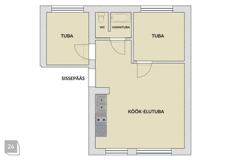Korteris on avatud köök-elutuba, 2 magamistuba, wc-vannituba ja esik.