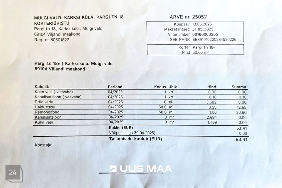 Korteri kõrvalkulude arvest foto on tutvumiseks leitav kuulutuse fotode hulgast. Lisaks kõrvalkulude arvel kajastatud tasudele lisandub korteris tarbitud elektritasu ja küttepuudele kuluv summa. Elektrilepingu on iga korteri omanik eraldi sõlminud.