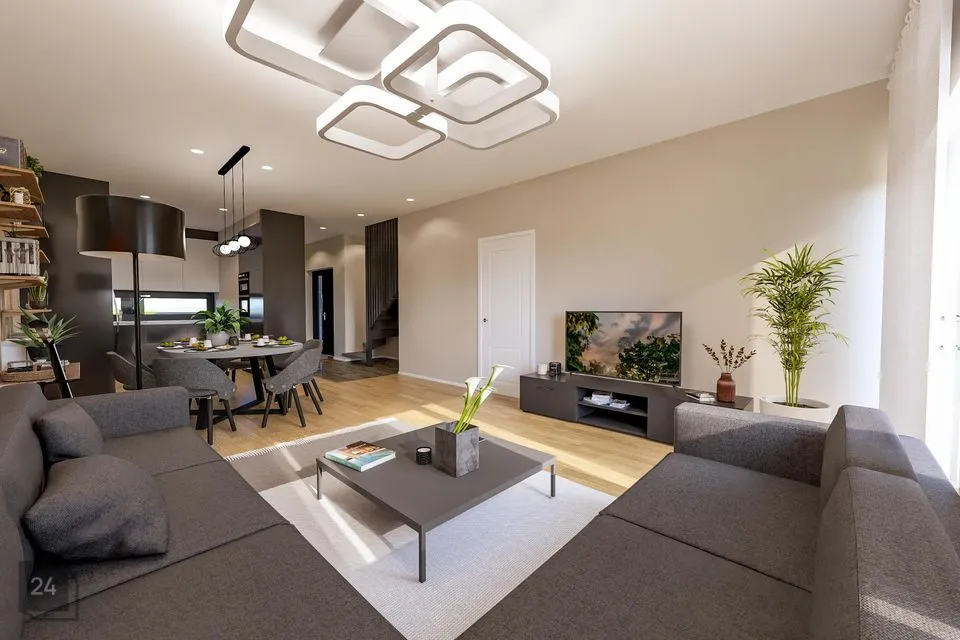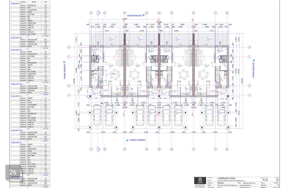Eluruumi pind 111,7m2, 4 tuba. Esimesel korrusel paikneb avar köök -elutuba suurusega 38,3m2, esik 4,8m2, saun ja pesuruum 8,7m2, WC 2,5m2 ja tehnoruum 5,1m2. Elutoast ja saunast pääseb terrassile mille suurus on 18,3m2