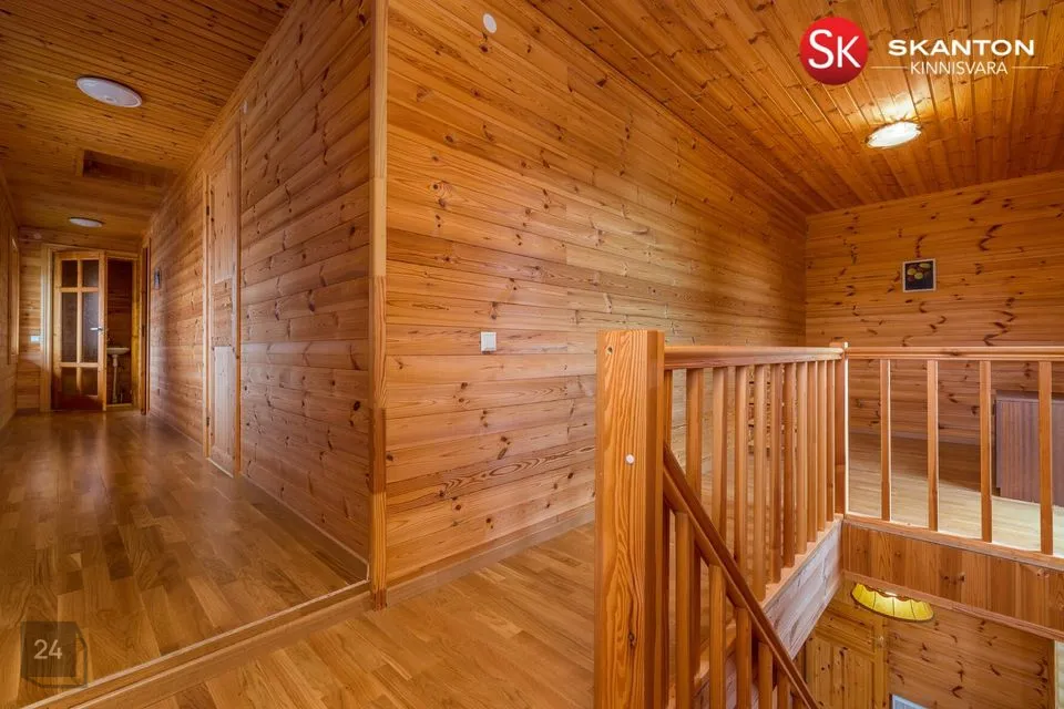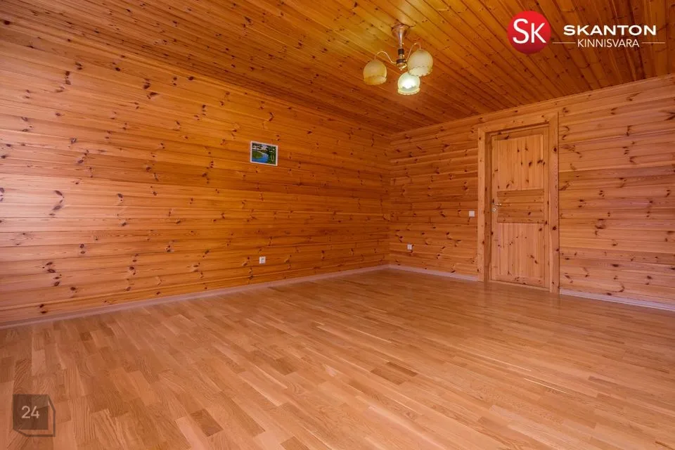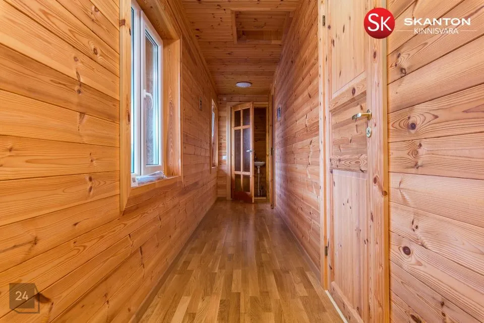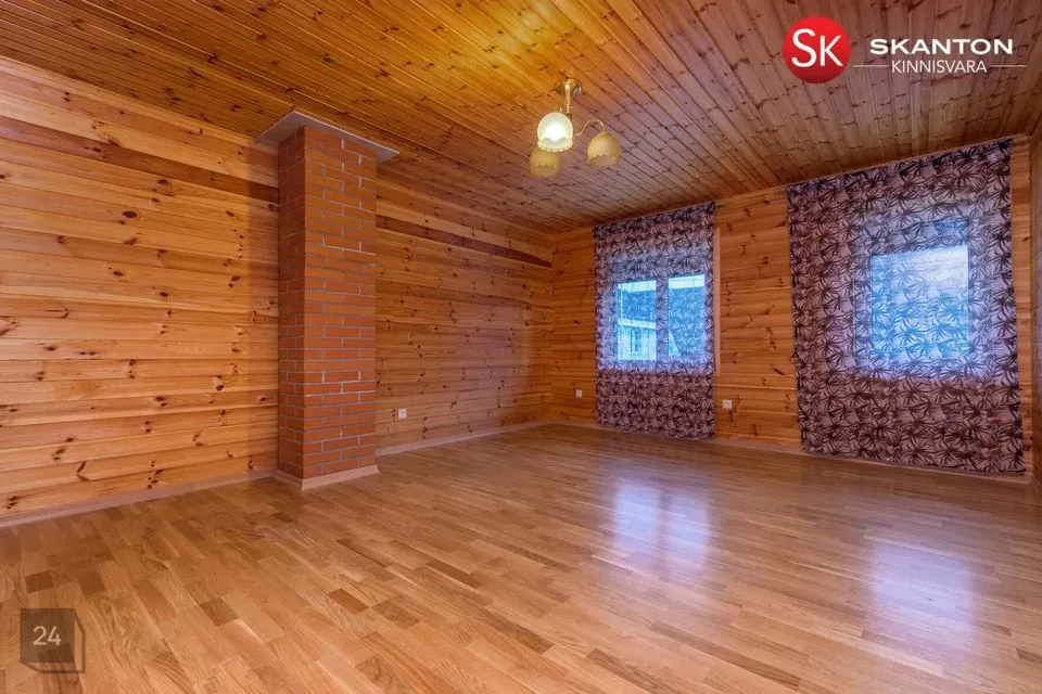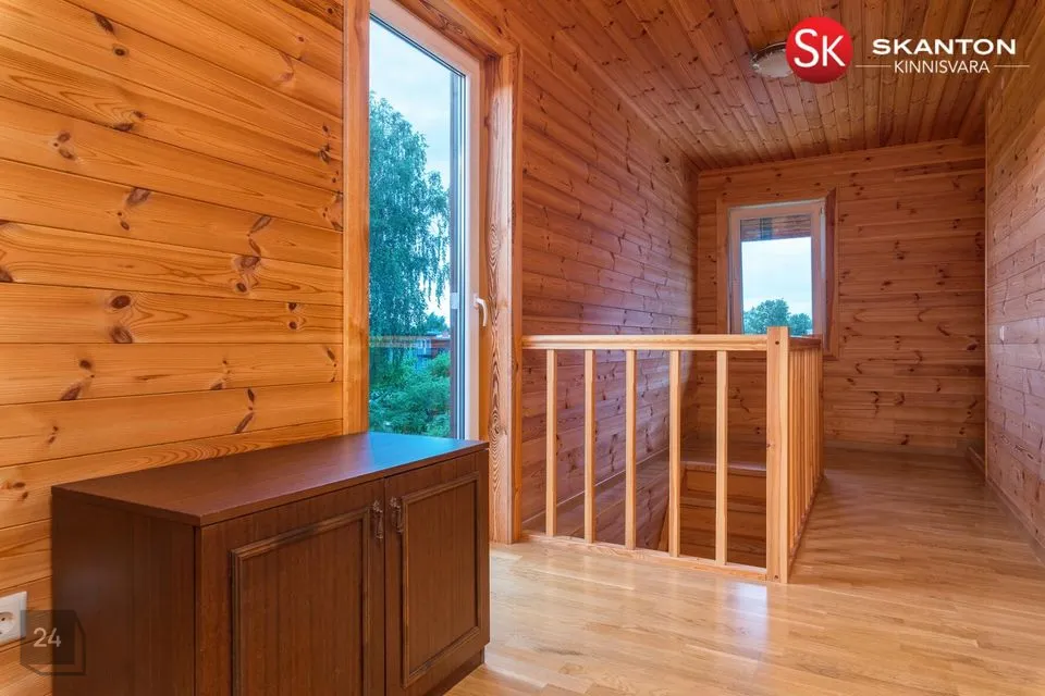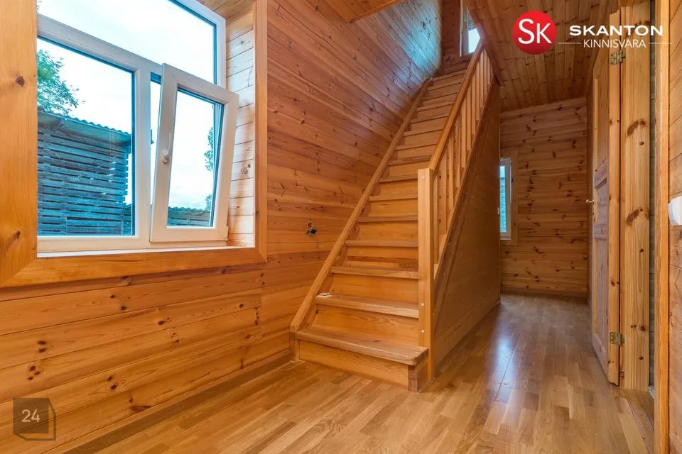 Hoonesse sisenedes võtab meid vastu väike koridor millest saab liikuda nii esimese korruse tubadesse kui ka teise korruse koridori. Esimesel korrusel asuvad elutuba, magamistuba ja läbikäidav puupliidiga köök. Koridorist on võimalik pääseda WC/dušširuumi, teisele korrusele ja keldrikorrusele, kus asub saun koos kaminasaaliga ning erinevad panipaigad. Teisele korrusel jääb kaks magamistuba, WC ja väljaehitamata katusealune, kuhu on võimalik teha veel üks tuba. Ülemiste tubade seinu katab laudvooder ja põrandaid tammeparkett.