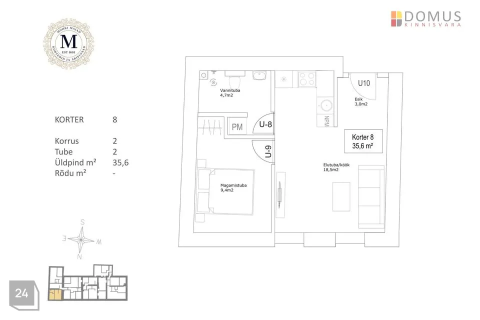 Müüdav korter on 2-toaline, 35,6 m² ja asub II korrusel. Selle korteri hind ei sisalda ja ei lisandu käibemaksu.