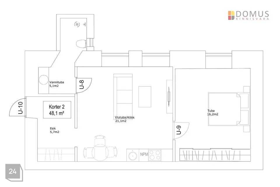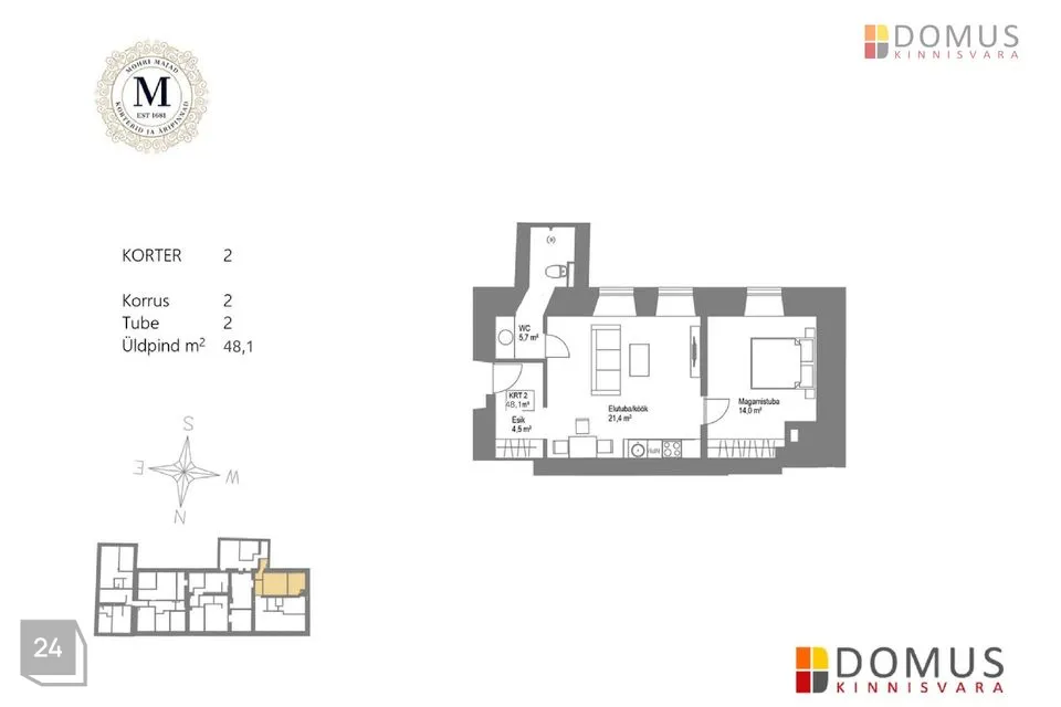 Müüdav korter on 2-toaline, 48,1 m² ja asub II korrusel, vaatega lõunasse.