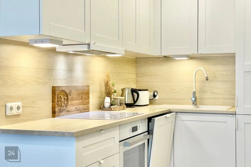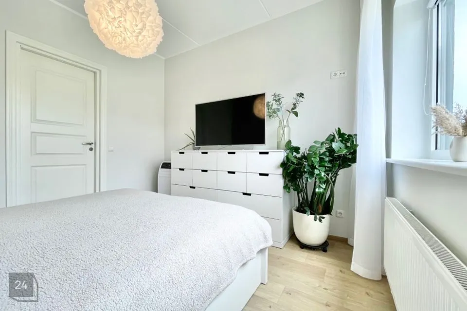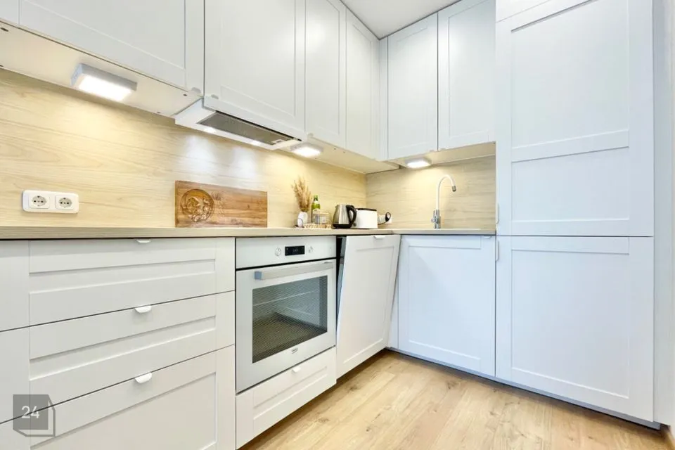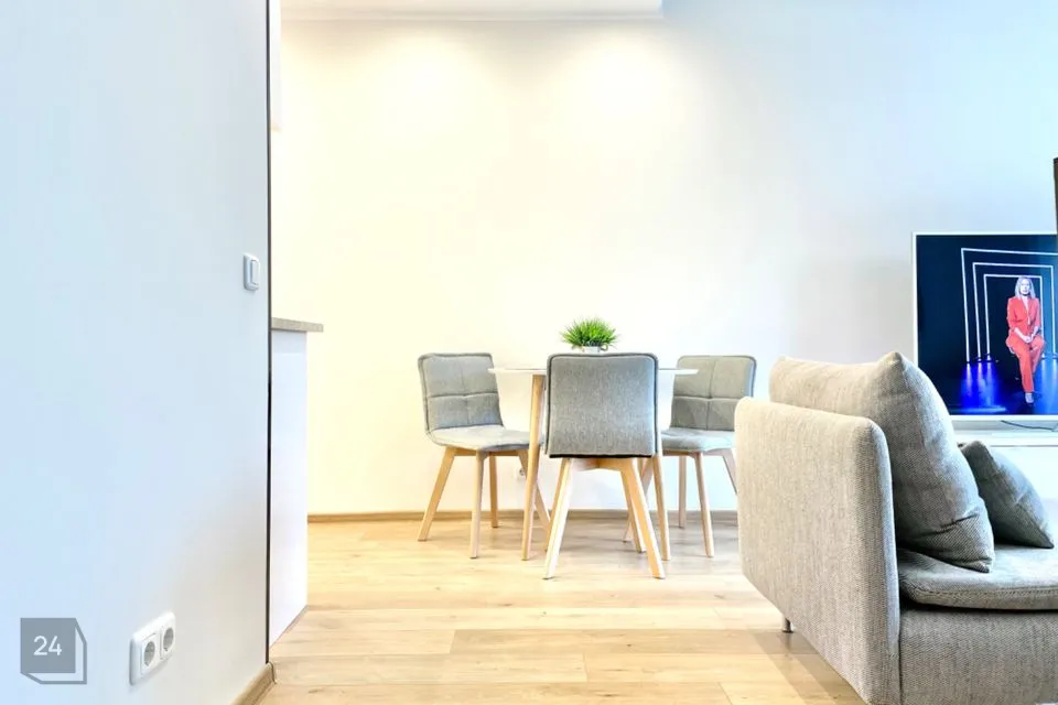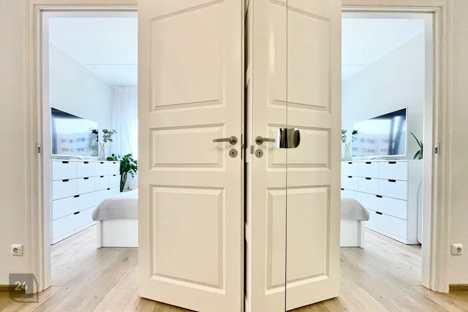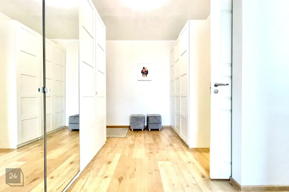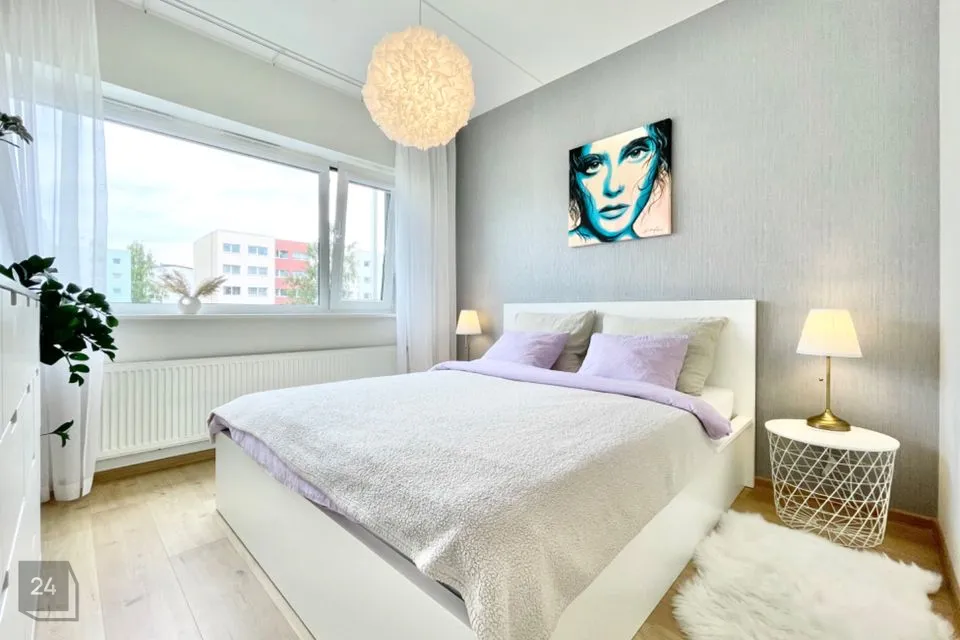 avara ja valgusküllase planeeringuga korteri koosseisu kuuluvad esik, avar elutuba-köök, suur magamistuba, suur tualett-duširuum
