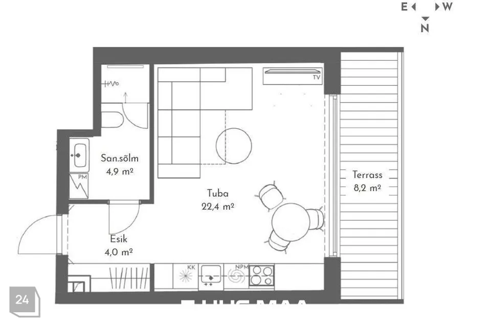 Esikus on koht garderoobikapile, köögile planeeritud ruum. Soovi korral saab kaasa soetada
