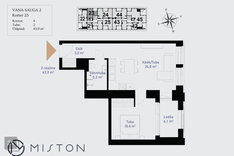 Vana-Sauga 2-23 on hea planeeringuga 2-toaline korter, mis asub kortermaja 4. korrusel. Korter koosneb avatud köök-elutoast, 1 magamistoast, vannitoast ning esikust. Rõdu (6,1 m²) on avatud hommikupäikese poole.