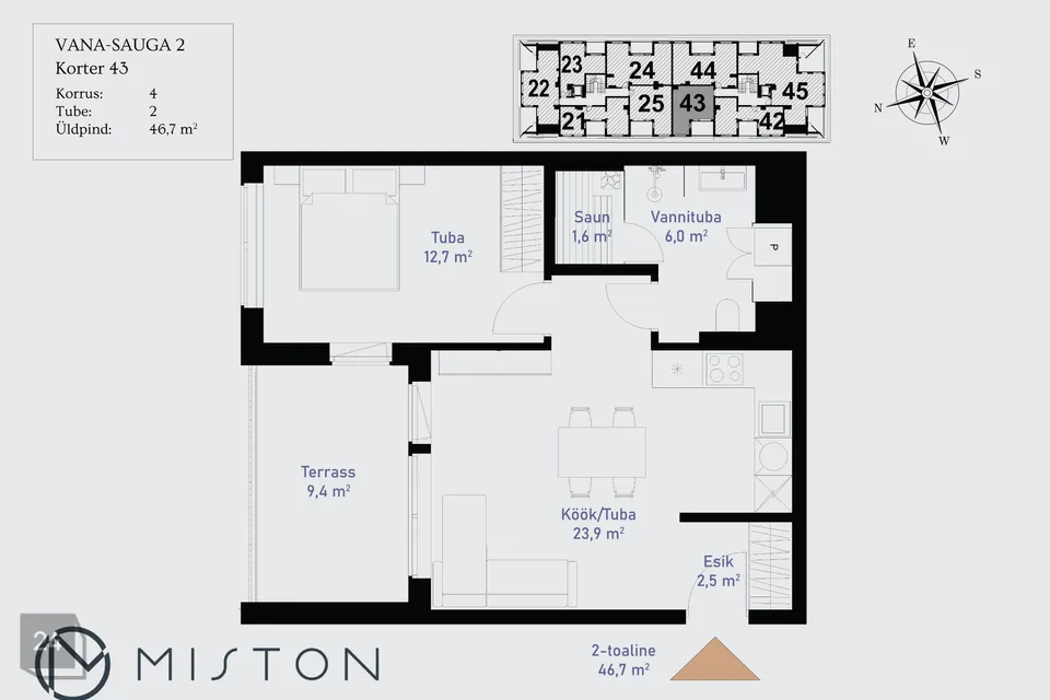Vana-Sauga 2 on hea planeeringuga 2-toaline korter, mis asub kortermaja 4. korrusel. Korter koosneb avatud köök-elutoast, 1 magamistoast, saunaga vannitoast ning esikust. Rõdu (9,4m²) on avatud õhtupäikese poole.