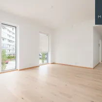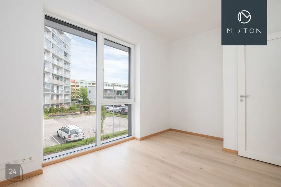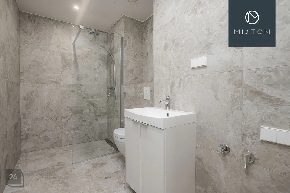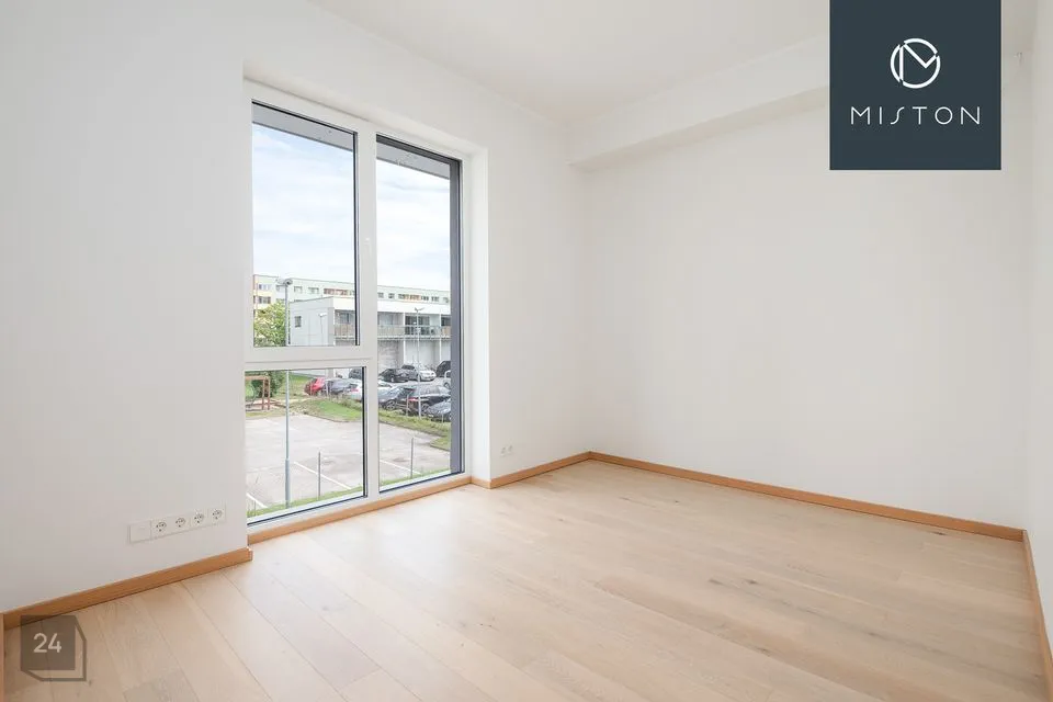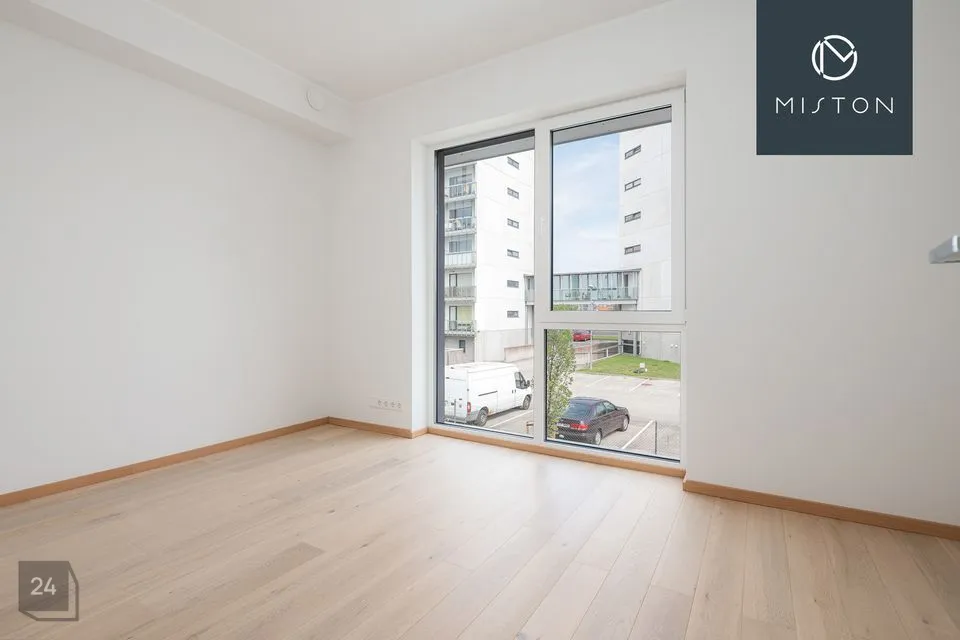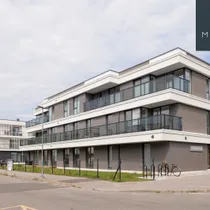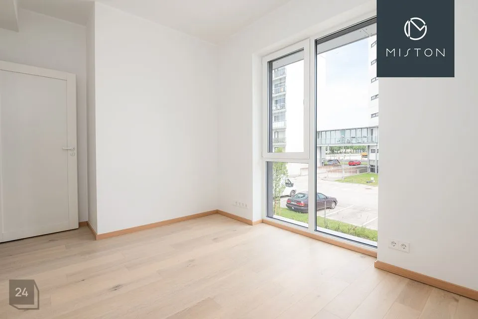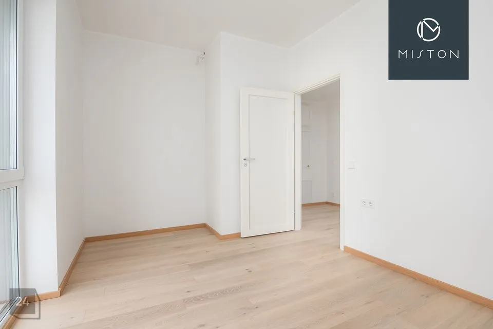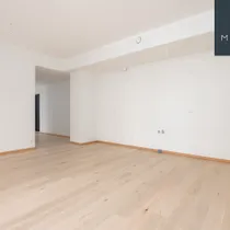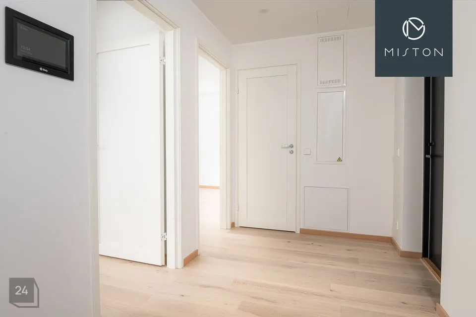 High-quality and durable materials have been used in the apartment’s interior. High ceilings and triple-glazed, energy-efficient floor-to-ceiling PVC windows add spaciousness to the apartments. The living spaces feature natural solid wood parquet floors. The bathrooms are equipped with quality sanitary fixtures and ceramic tiles with stone patterns and porcelain finishes. The apartment has underfloor heating, heat-recovery ventilation, and cooling readiness.