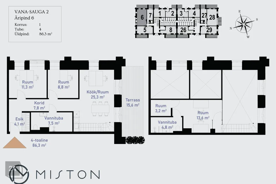 Vagabondi Loftide külaliskorter 6 on hea planeeringuga 4-toaline loft tüüpi äripind, mis asub kortermaja 1. korrusel. Äripind on läbi kahe korruse, koosneb avatud kööginurgaga elutoast, 2 magamistoast esimesel korrusel, 2 vannitoast (üks on saunaga), esikust, garderoobist ning pool korrusel asuvast magamistoast. Terrass (15.6 m²) on avatud hommikupäikese poole.