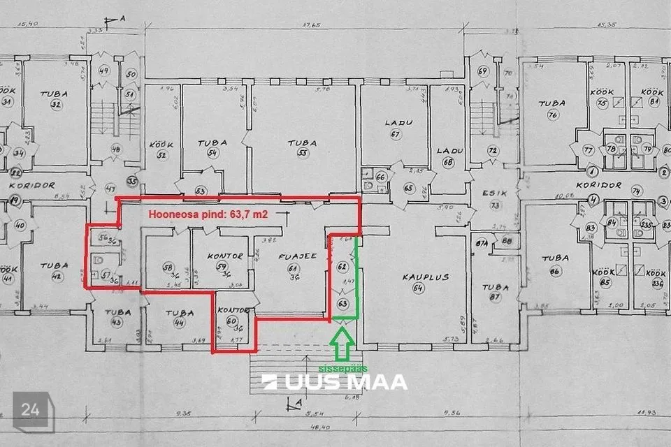 Müüa kapitaalselt renoveeritud korterelamus eraldi sissepääsuga mitteeluruumiga nr M36 mille üldpind on 63,7 m2. Ehitusregistri järgi on tegemist mitteeluruumiga, mis on võimalik muuta eluruumiks. Ruumid vajavad renoveerimist. Eluruumides keskkküte puudub. Võimalikud küttelahendused: elekter, kamin/ahi. eelnevalt on olnud kamin.