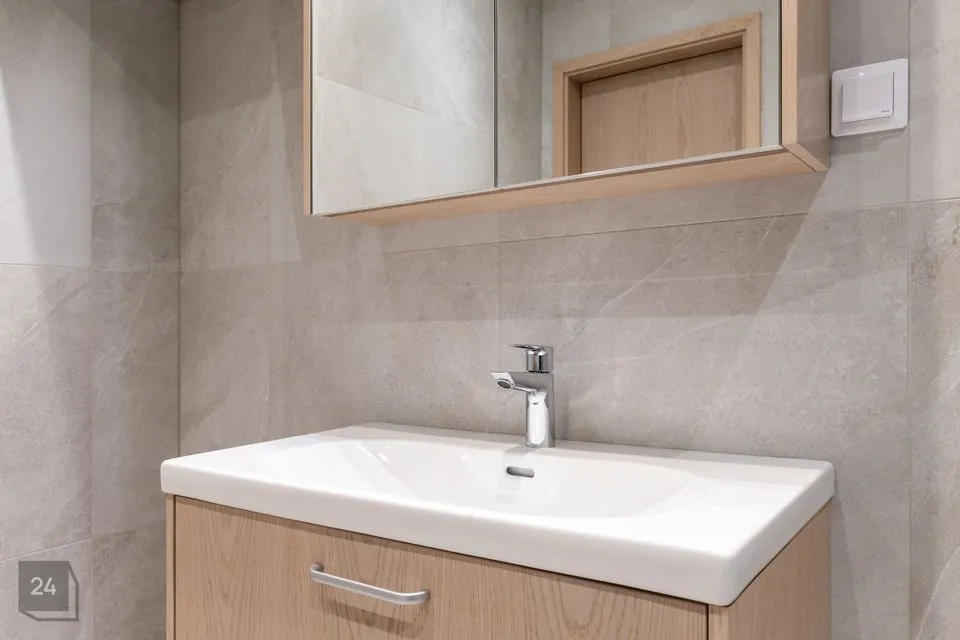 Отделка квартиры выполнена со вкусом и современно. В квартире много естественного света, а потолки высотой 2,8 м придают дополнительное пространство.