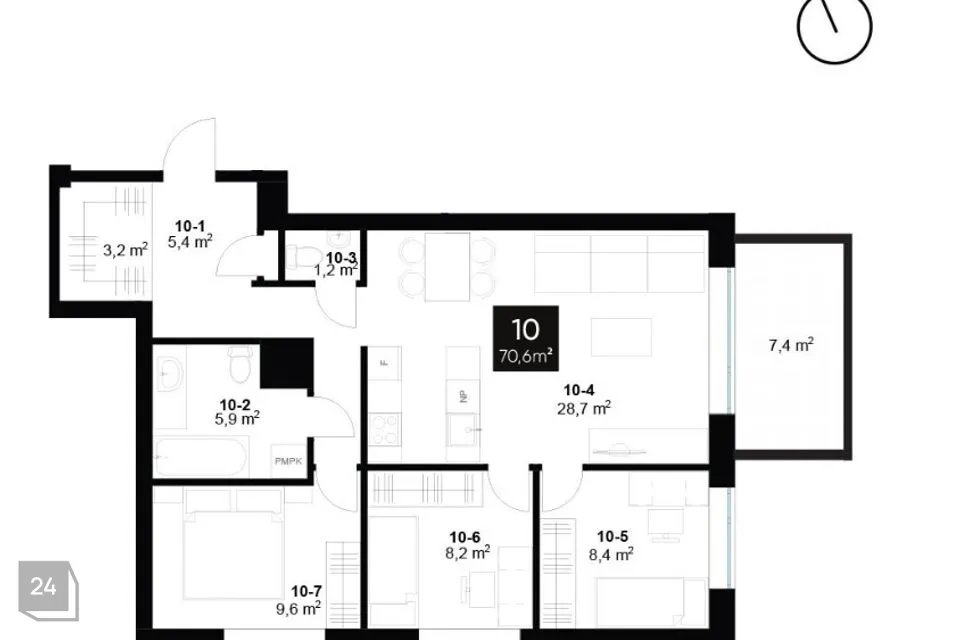 Korteri koosseisu kuulub suur esik garderoobi niššiga, WC, WC-vannituba, köök-elutuba, kust on pääs rõdule, 3 magamistuba.