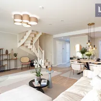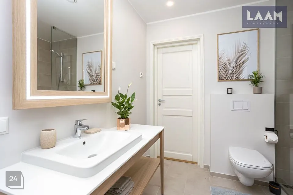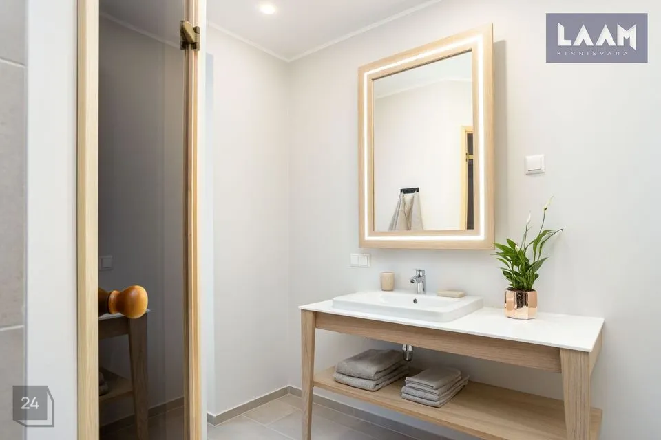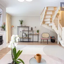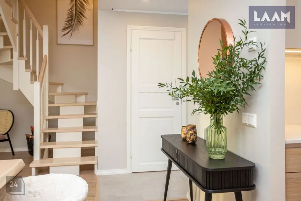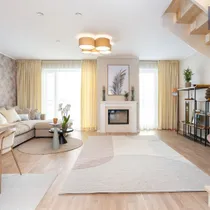 •Siseviimistlusega luuakse hubane kodu, kus on mahedad toonid ja kvaliteetsed materjalid. Kasutatud on naturaalset tammepuitparketti, keraamilisi plaate ja SWEDOOR'i mantelservaga massiivuksi. Sanitaartehnika firmadelt DURAVIT ja HANSGROHE.