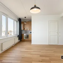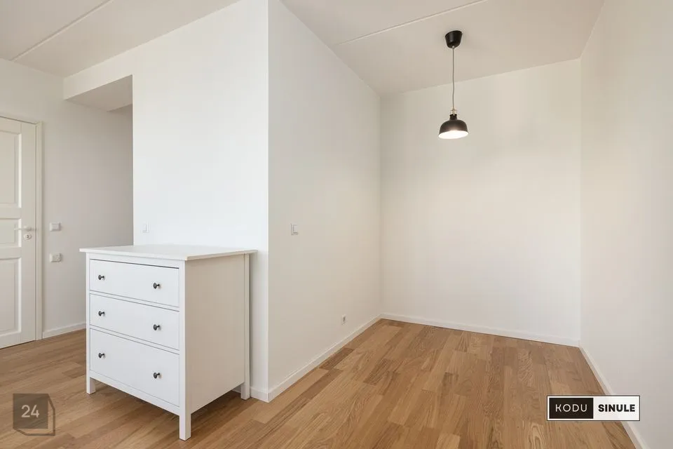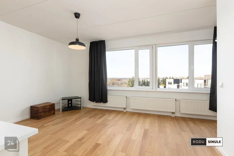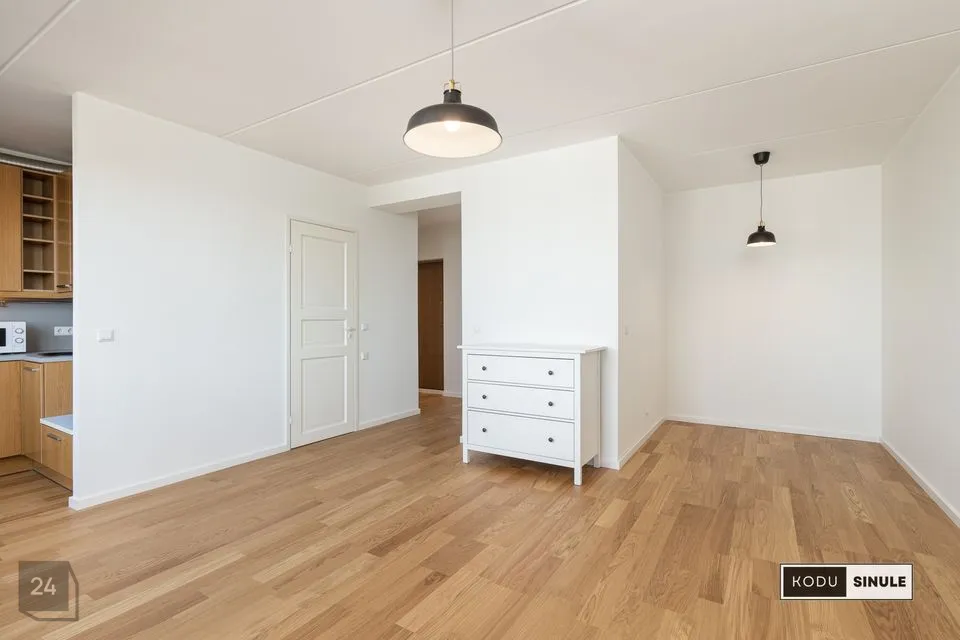 Neljandal korrusel asuv korter. Korterisse sisenedes on esik ning lisaks garderoobiruum. Edasi liikudes on suur elutuba avatud köögiga.