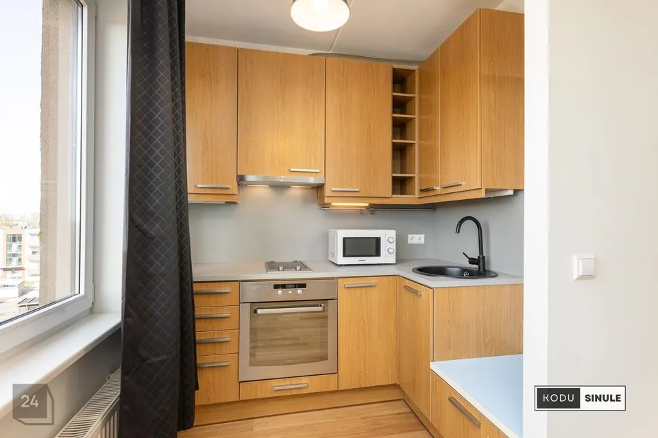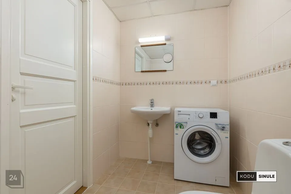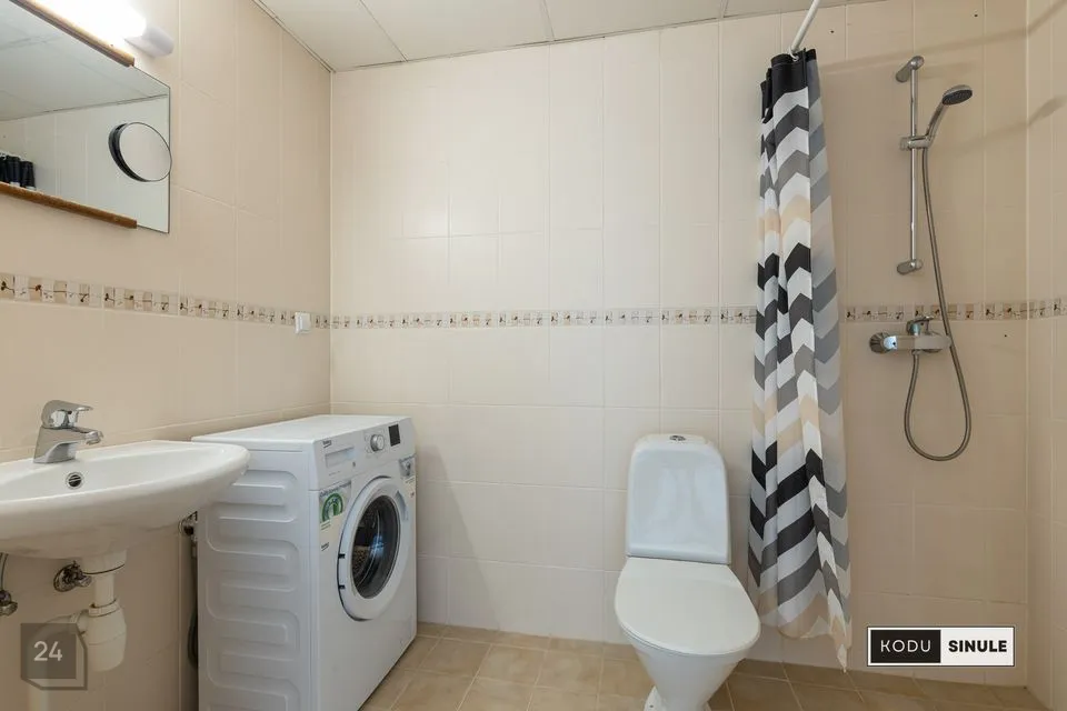 Korteris on köögimööbel tehnikaga, vannitoas pesumasin, elutoas teleka alus.