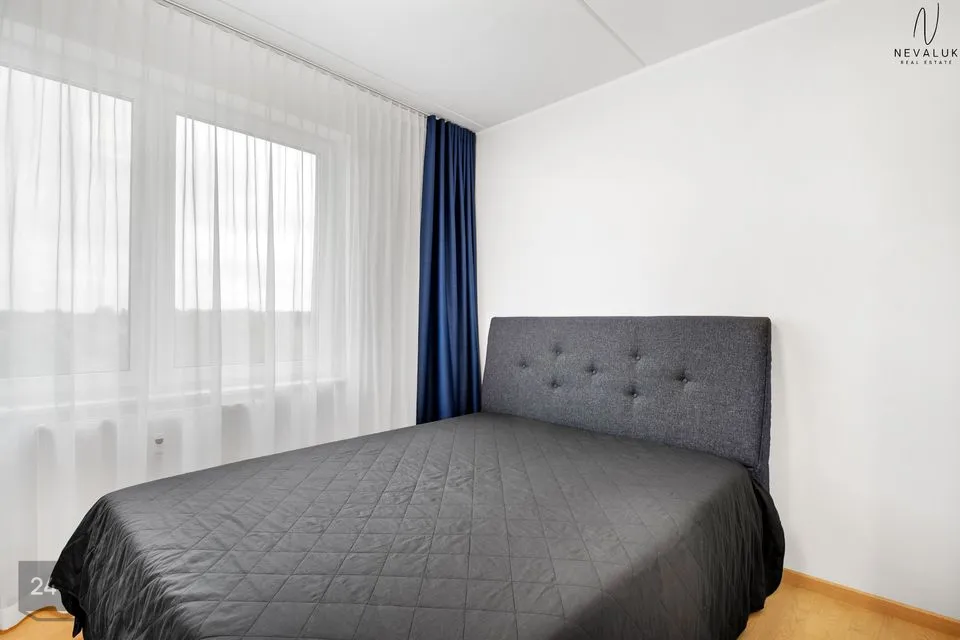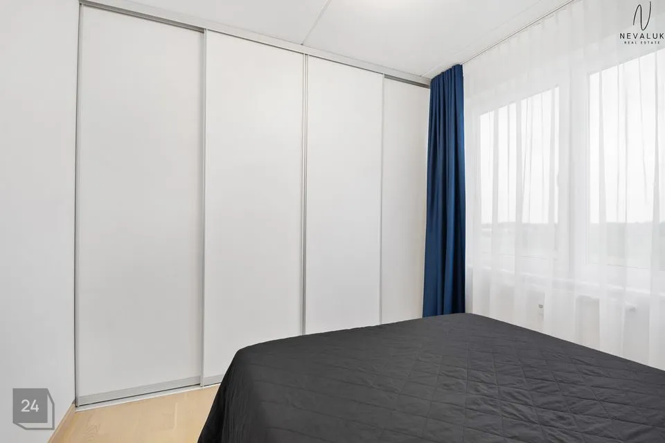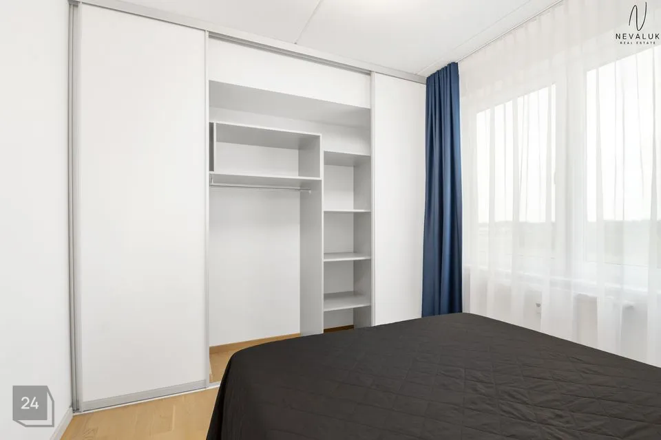 Magamistuba on privaatne ja vaikne, aknast paistavad rohelised puud ning niidetud muru. 160 cm lai voodi on mitte ainult mugav, vaid ka funktsionaalne – voodi alla peidetud hoiuruum mahutab kõik, mida silma alt ära soovid. Seinal on liugustega suur kapp, mis aitab hoida toa korras ja avara.