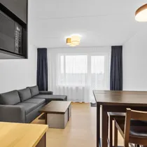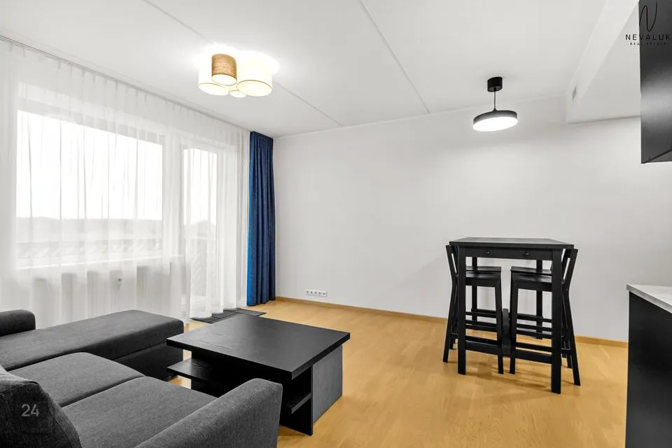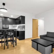 Korteri elutuba ja köögiala moodustavad avara ning kutsuva keskuse, kus hommikukohvilõhn seguneb rohelise vaate rahuga. Baarilaud nelja tooliga loob mugava söögiala või töökoha, mille kohal asuv puldist reguleeritav LED-valgusti aitab luua just sellise meeleolu, nagu hetkel vaja – olgu see soe õhtusöögivalgus või ergas päevane töövalgus.