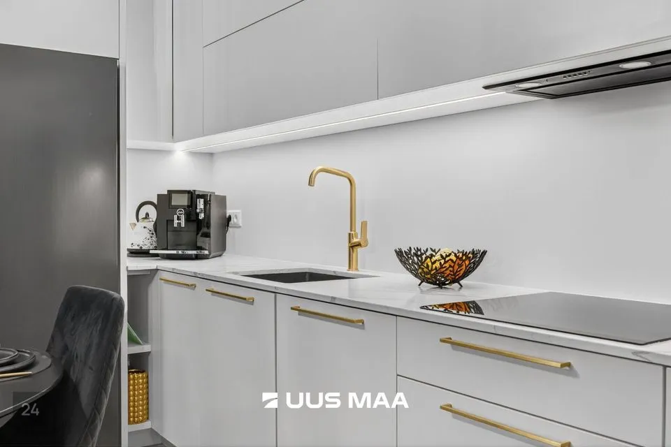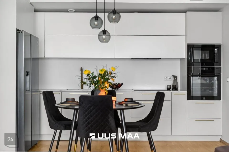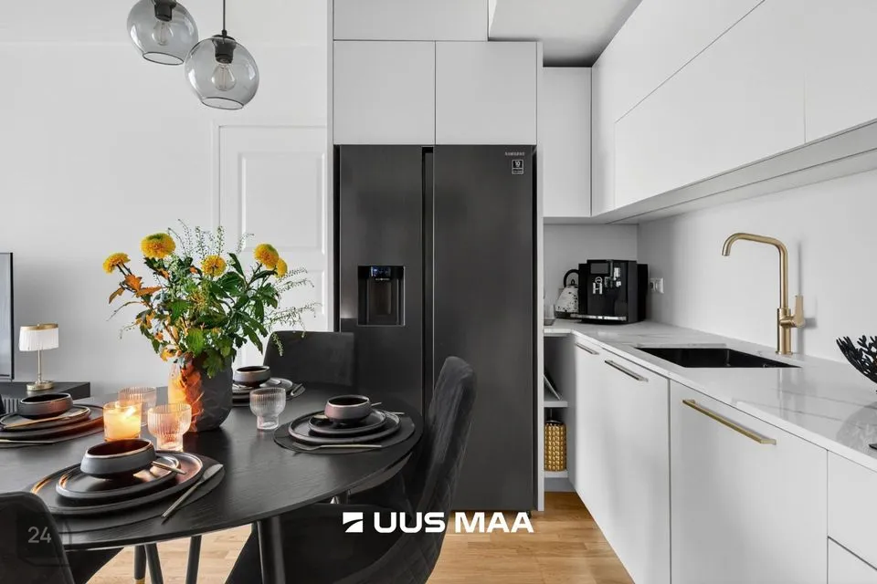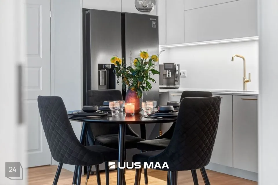 Eluruumi südameks on avatud köögiga elutuba, kust pääseb 13,5 m² suurusele rõdule – ideaalne koht hommikukohvi nautimiseks.. Köögimööbel koos funktsionaalse kivist tasapinnaga, on valmistatud eritellimusel, ning koos kvaliteetse tehnikaga jääb see uuele omanikule.