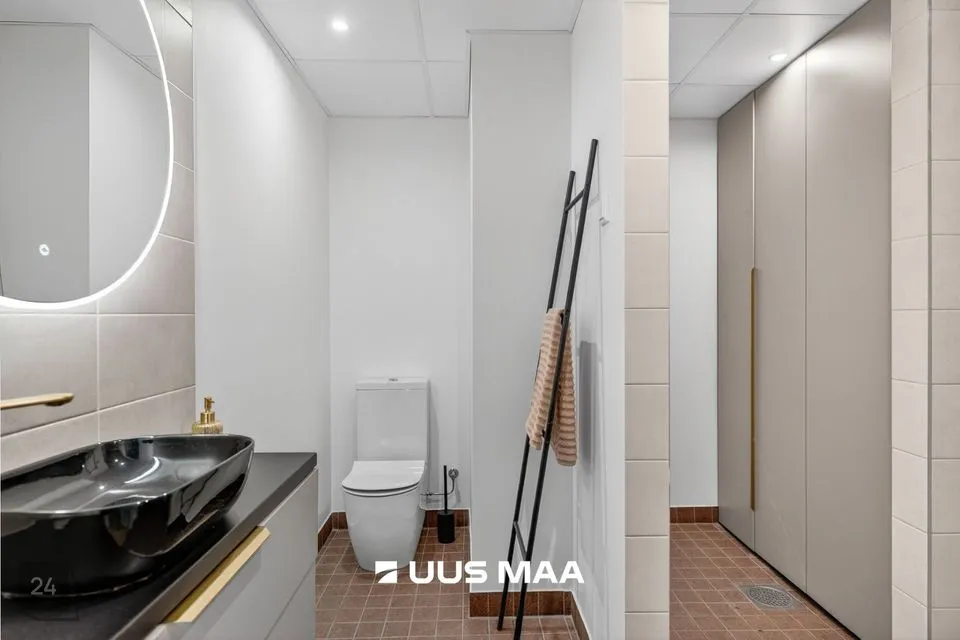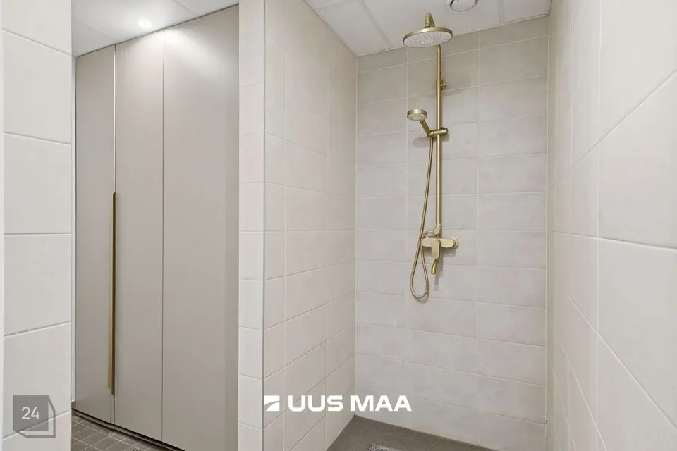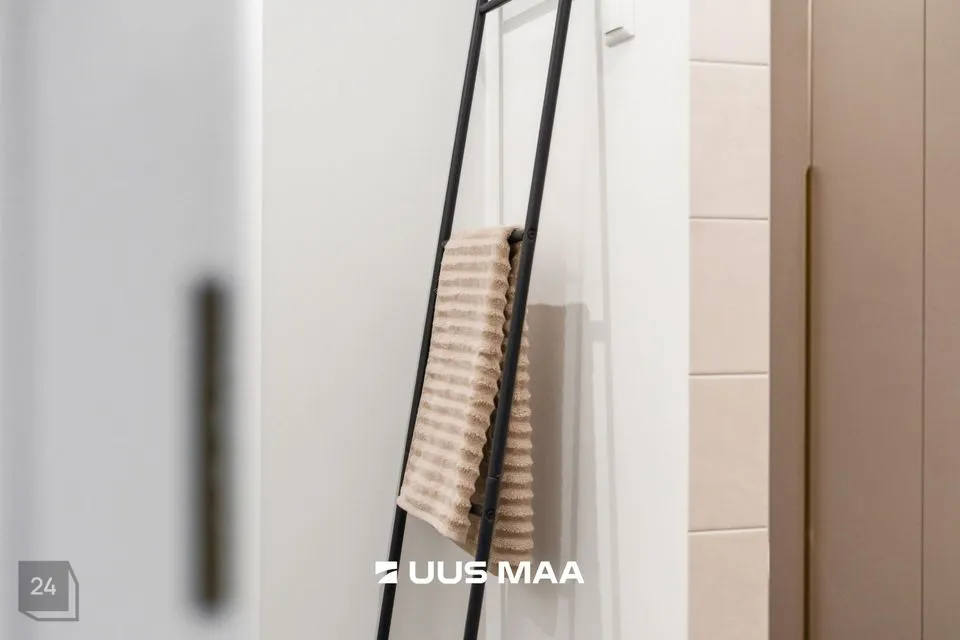 Lisaks on korteris vannituba koos eraldi majapidamisruumi nurgakesega, mis muudab igapäevased toimingud oluliselt mugavamaks. Kõik majapidamistöödeks vajalik, sh pesumasin, on peidetud kappi, mis on tehtud samuti eritellimusel.