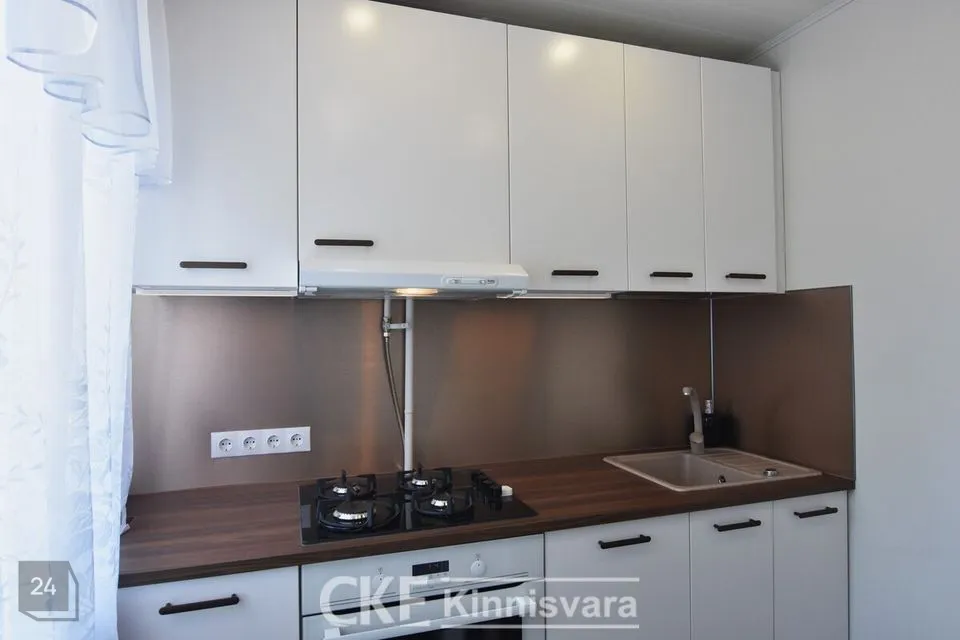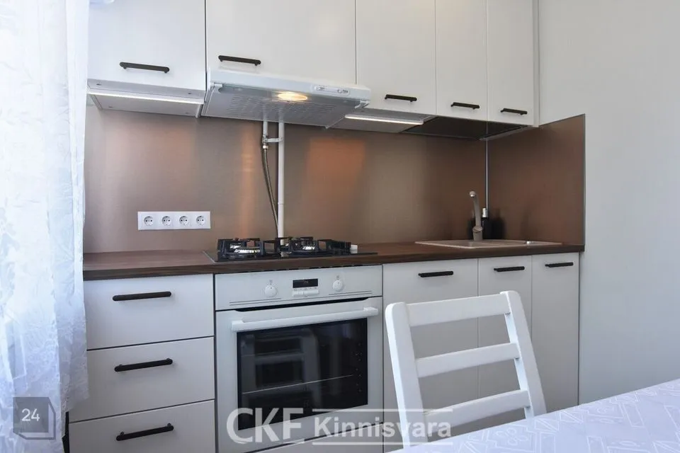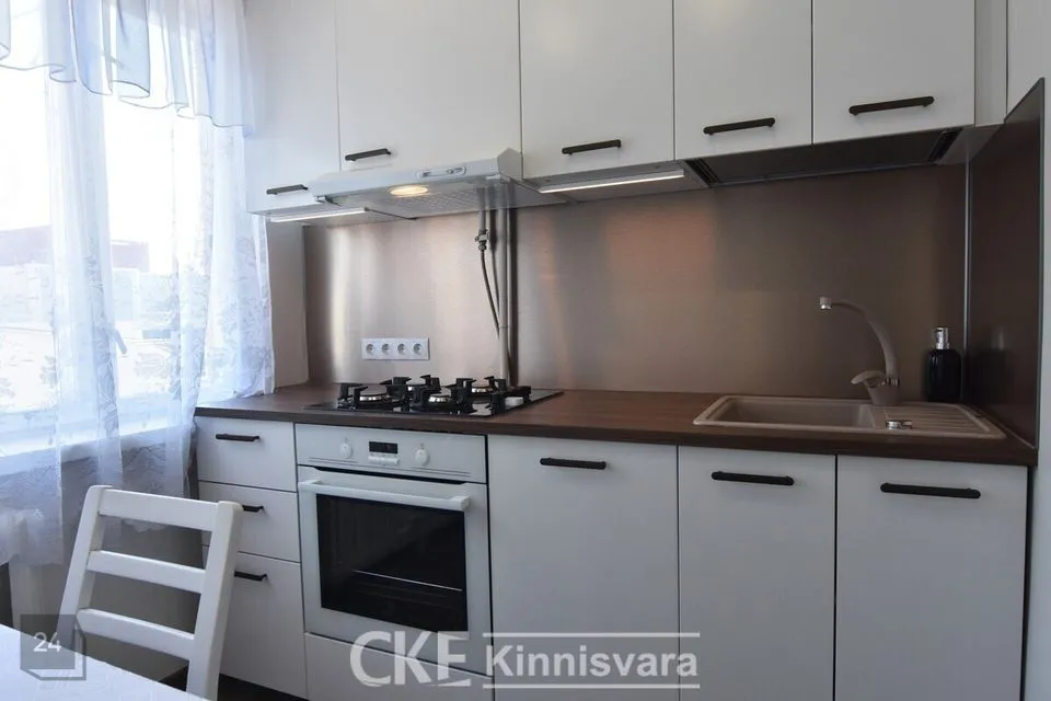 Põrandatel laminaatparkett kalasaba mustriga, köögis Ikea mööbel, gaasipliit, aurutõmbaja.