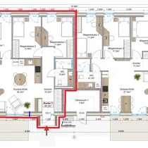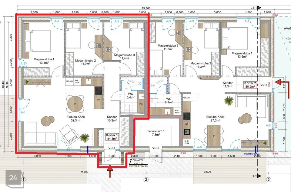 Hästi läbimõeldud planeering kus on avar ja valgusküllane 32m2 elutuba avatud köögiga, 3 magamistuba ning duširuum/WC.