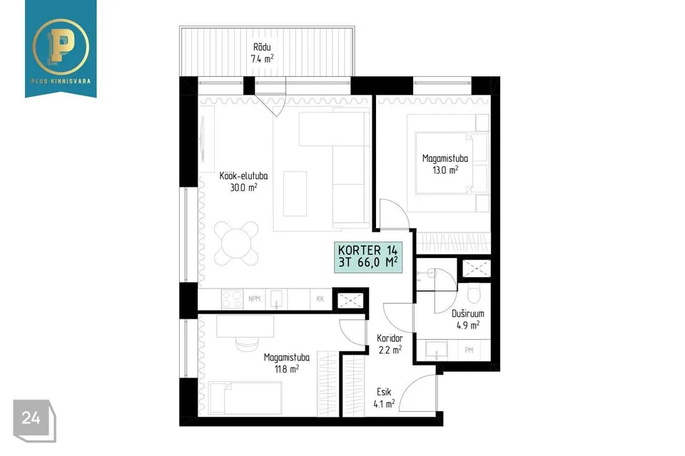 Korter nr 14 on avara ja läbimõeldud planeeringuga 3-toaline kodu, kus on esik, kaks magamistuba, duširuum/WC ning avatud köögiga elutuba. Elutoast pääseb 7,3 m2 suurusele rõdule – täiuslik koht hommikukohviks või õhtuseks lõõgastumiseks.