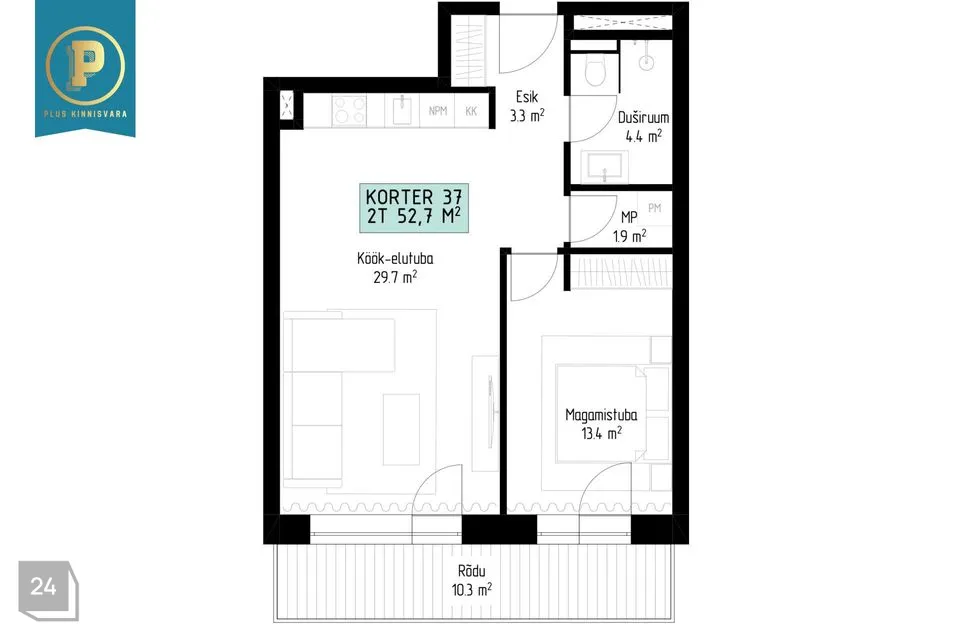 Korter nr 37 on väga mugava ja keskmisest suurema planeeringuga 2-toaline kodu, kus on esik, avatud köögiga elutuba, magamistuba, vannituba-tualett, rõdu ning lisaks veel majapidamisruum. Elutoast pääseb 10,3 m2 suurepäraste vaadetega rõdule – täiuslik koht hommikukohviks või õhtuseks lõõgastumiseks.