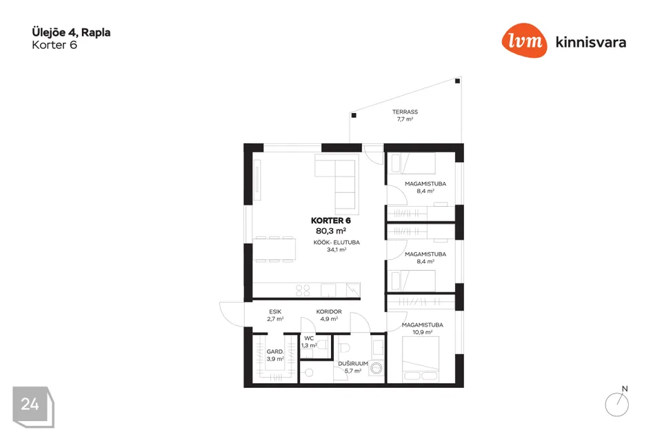 Esik; garderoob; eraldi wc; pesuruum; kolm magamistuba ning avatud köök-elutuba.