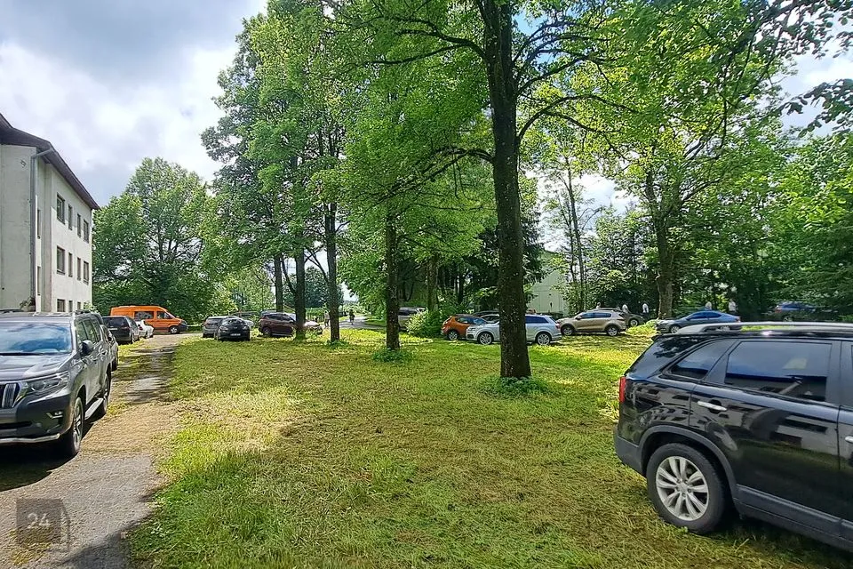 Hoone ümber on asfalteeritud teed ja parkimisplatsid kummalgi pool elamut.