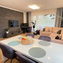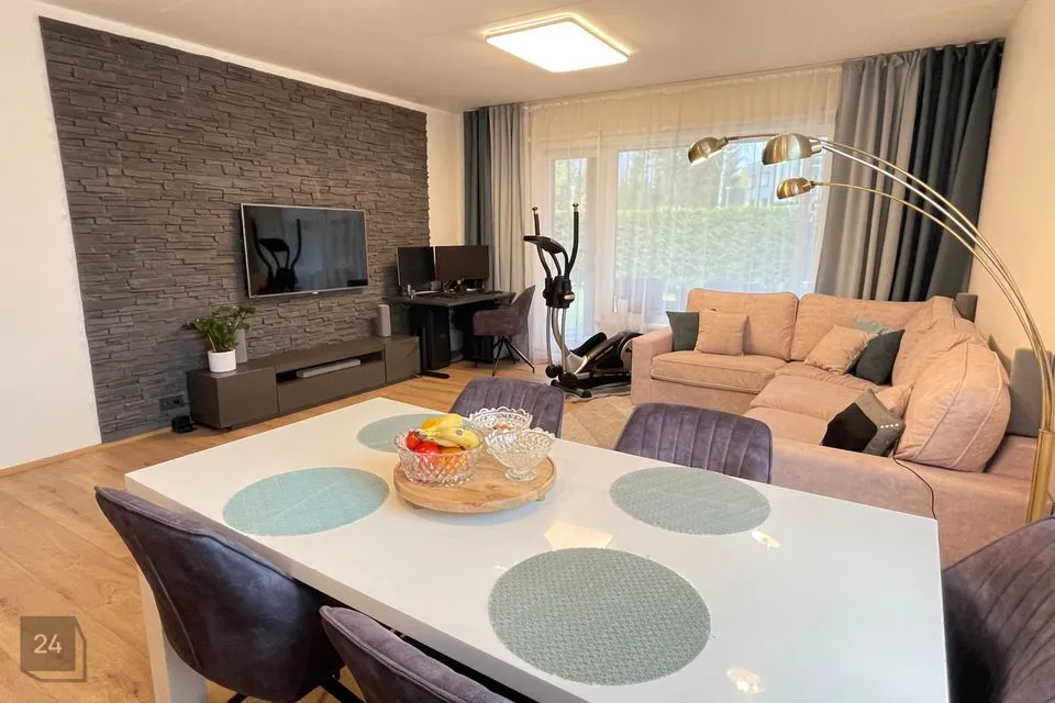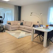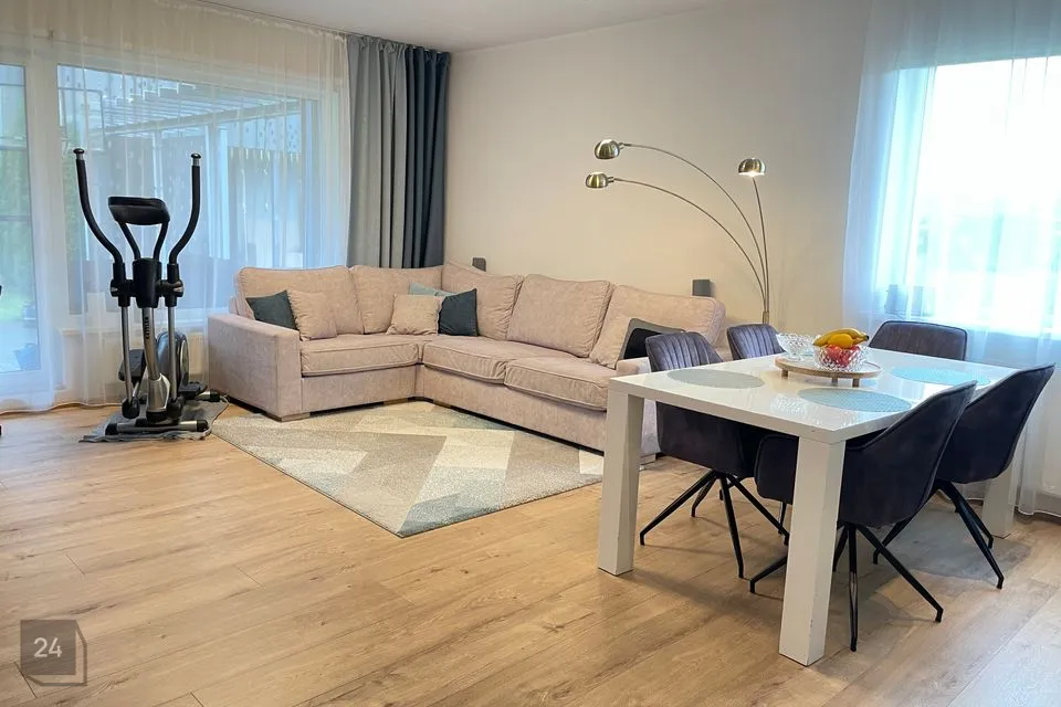 30m2 avatud köögiga elutoa seinad on värvitud heledates toonides, millele lisab kontrasti sarnaselt köögi tagaseinaga efektne looduskivi. Köök on kontrastses hall-valges toonis, mida täiendab struktuurne ülemiste kappide rida. Köök on kasutamiseks valmis integreeritud tehnikaga (külmkapp, pliit, ahi, õhupuhastaja, mikrolaineahi, nõudepesumasin), millele lisab mugavust nõudepesumasina põrandale kuvatav töö lõpu aeg ning müksamis-funktsiooniga prügisahtel. Valgesse graniitvalamusse on integreeritud ka seebidosaator. Köögi ajaga kaasas käimist toetab külmkapile lisatud internetiühenduse võimalus.