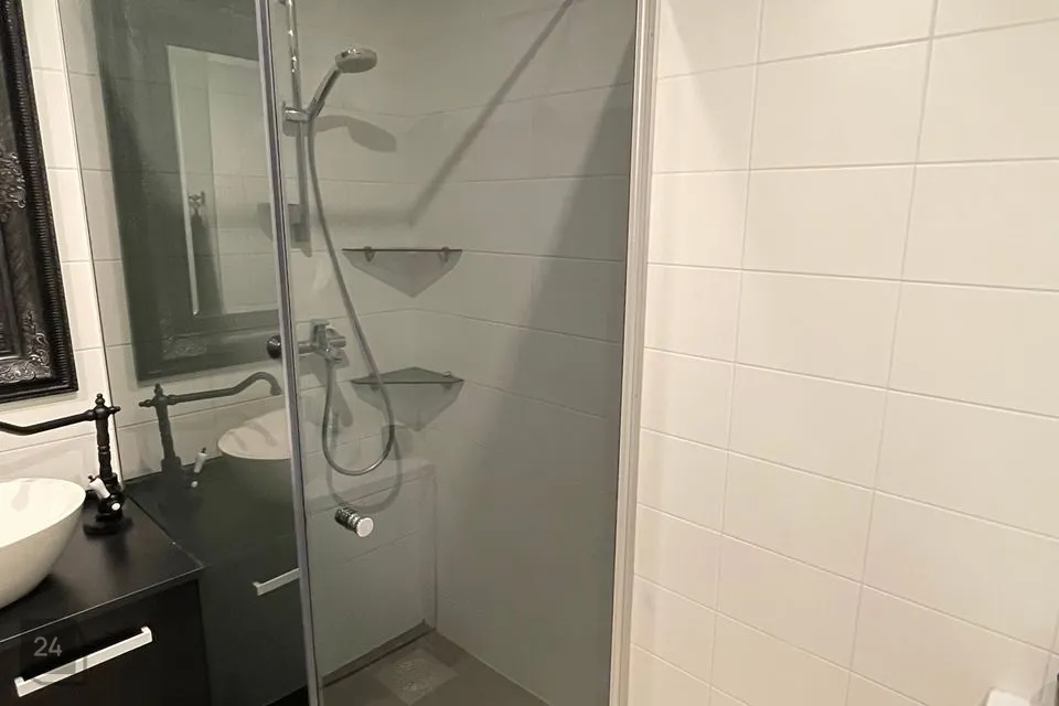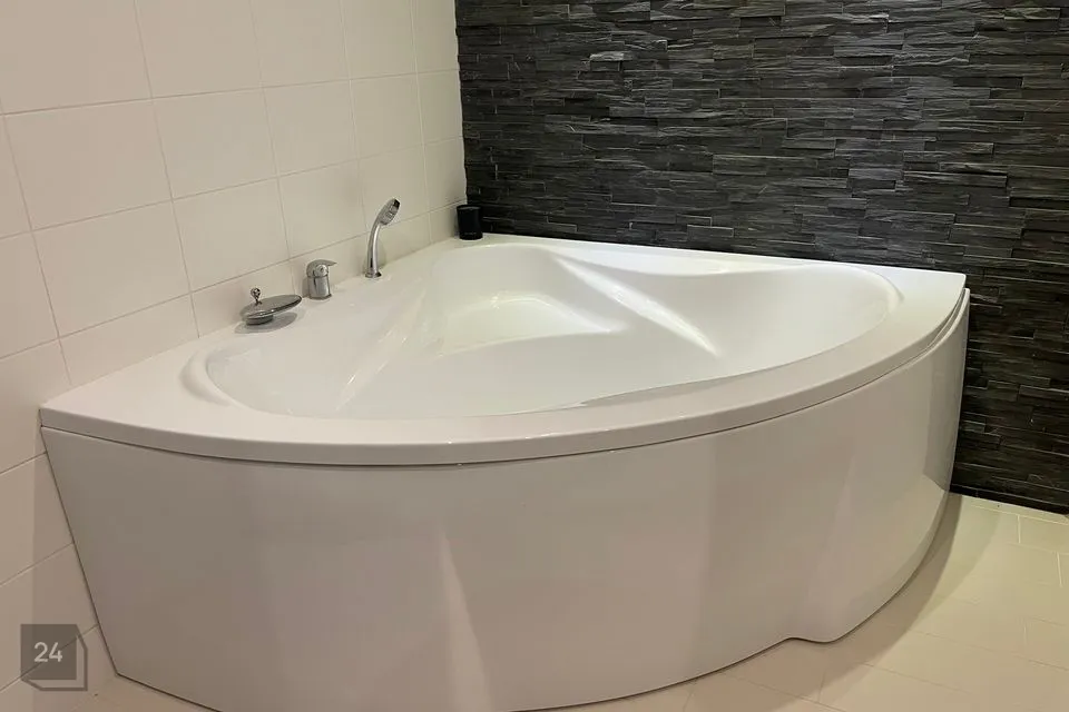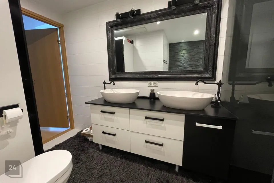 Suures vannitoas (9m2) on seintel ning põrandatel valged plaadid, millele on lisatud kontrasti dekoratiivkivist seinaga. Lisaks on vannitoas kahe Xonyx kivimassist (Balteco) valamuga kapp, mis võimaldab pereliikmetel näiteks samaaegselt hommikuhügieeni teha ja nutipeeglilt pere nädalagraafikut või uudeiseid lugeda. Kuivati ja pesumasina saab silma alt peitu panna selleks ette valmistatud nurgakappi.