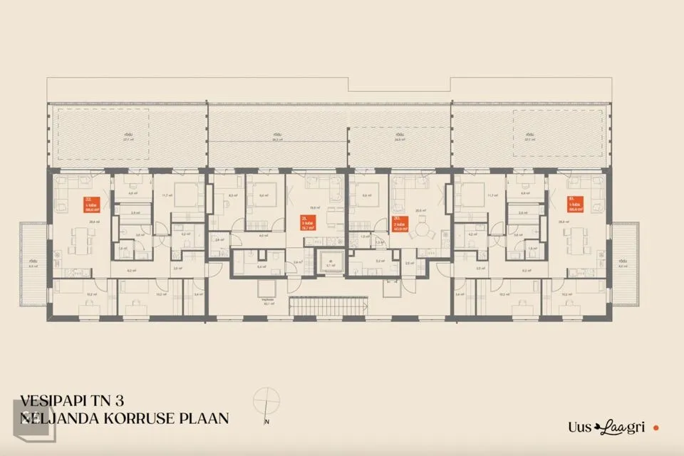 Uus-Laagri arendus pakub kvaliteetset ja kaasaegset elukeskkonda. Tänu läbimõeldud energialahendustele, nutikale planeeringule ja rohelisele ümbrusele on see ideaalne valik peredele ja tänapäevast elustiili hindavatele inimestele. Esimese etapi hooned on planeeritud kolmekorruselised, ühe maa-aluse tasapinnaga ning hõlmab kokku 23 + 23 korterit. Veehaldja 9 ja Veehaldja 11 hooned valmivad sügis 2026. Teise etapi hooned, Veehaldja 12 ja Vesipapi 3, on planeeritud neljakorruselised, mis hõlmavad 22 + 22 korterit. 2.etapi ehituse algus on planeeritud kevad 2026 ning valmivad suvi 2027.
