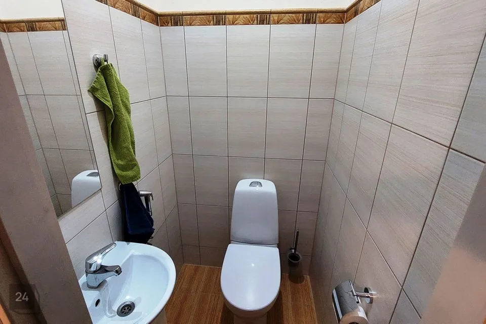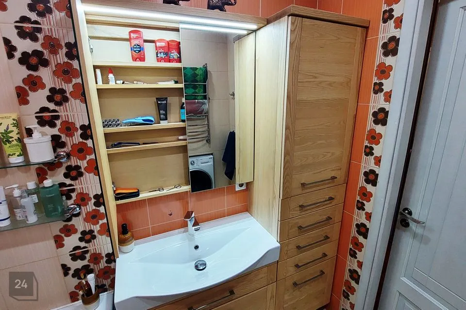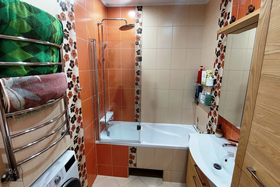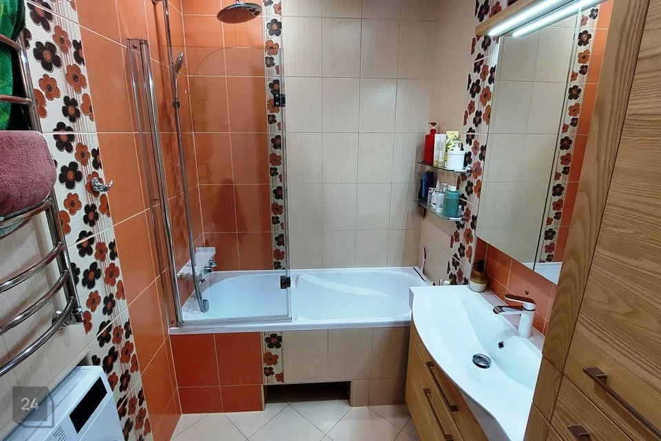 · В ванной комнате – капитальный ремонт, положена плитка, подогрев пола, новая сан. техника, стиральная машина. Грамотно распределено место для стиральной машины и шкафчиков.