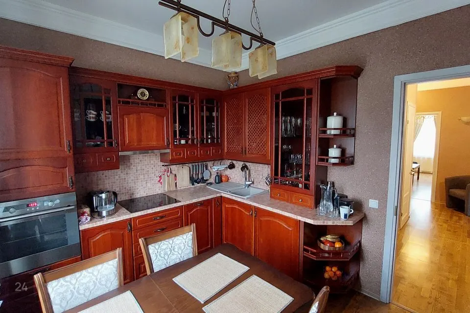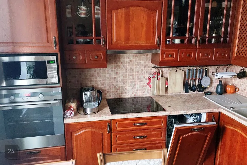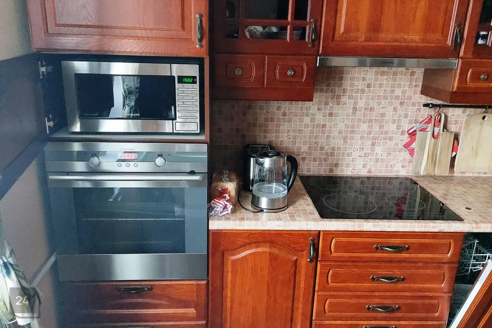 · Функциональная кухня - кухонная мебель - сделанная на заказ (дуб) с качественной фурнитурой. Кухня оснащена всем необходимым: эл. варочная поверхность, духовой шкаф, холодильник, микроволновка, вытяжка, посудомойка, дополнительная рабочая зона для готовки. Использована только качественная интегрированная техника.