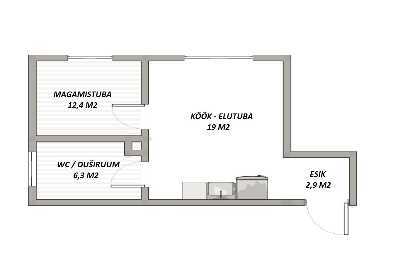 40,6m² suuruse korteri mõlemad toad kagu-lõuna suunas. Väiksest keraamiliste põrandaplaatidega esikust pääseb köök-elutuppa, edasi magamistuppa ja WC / duširuumi. Tubade seinad enamuses värvitud, põrandaltel parkett. Duširuum keraamiliste plaatide ja elektrilise põrandaküttega. Tubades elektriradiaatorid, võimalus paigaldada õhk-soojuspump. Soe vesi vannitoas asuvast elektriboilerist.
