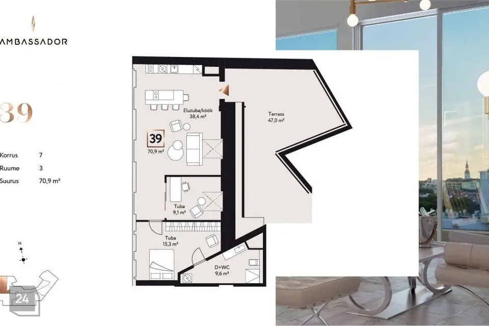 https://endover.ee/ambassador/hinnad/#korterid/32-2KORTER 39 on väga eriline 3-toaline korter südalinnas. Penthouse korteri maast laeni panoraamaknad vaatega Vanlinnale loovad sellele kodule tõeliselt valgusküllase ning luksusliku atmosfääri. Korteri juurde kuulub kogupäeva päikesega 47m2 suurune privaatne katuseterrass vaatega vaiksele rohelisele sisehoovile.