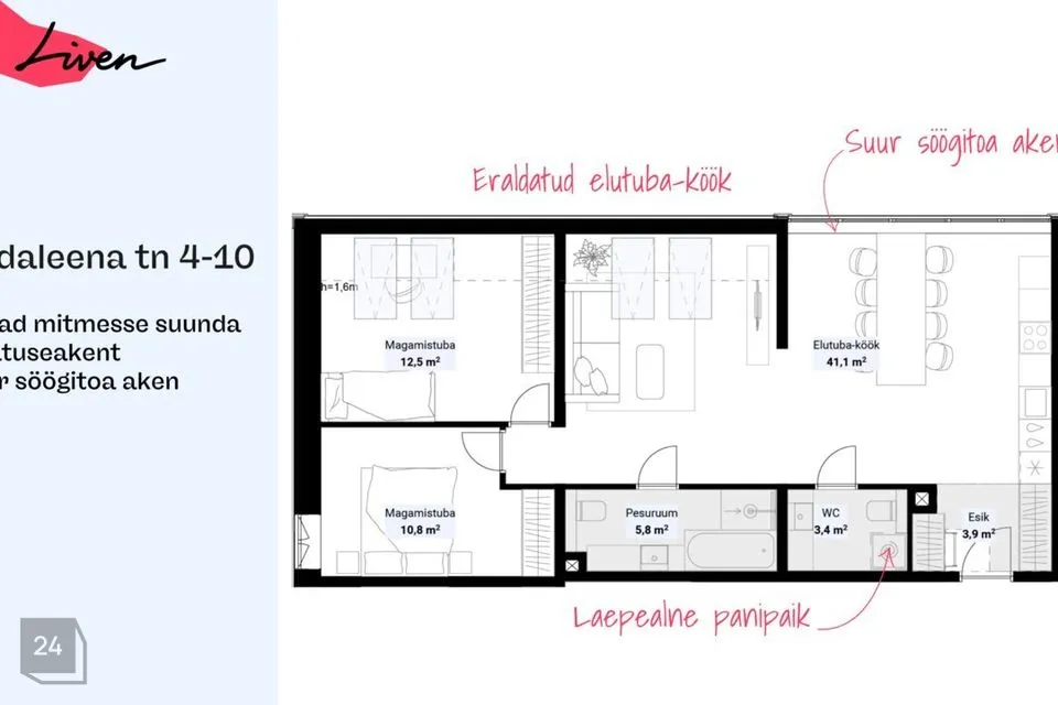 Magdaleena 4/1 on 3-korruseline uus maja, millel säilivad mõned miljööväärtusliku hoone elemendid. Kuigi kõik konstruktsioonid ja ka fassaadipuit on uued, sobitub viilkatusega maja keskkonda nagu valatult. Hoones on vaid 10 korterit, iga kodu juurde on planeeritud väliparkimiskoht suletud õuealal.