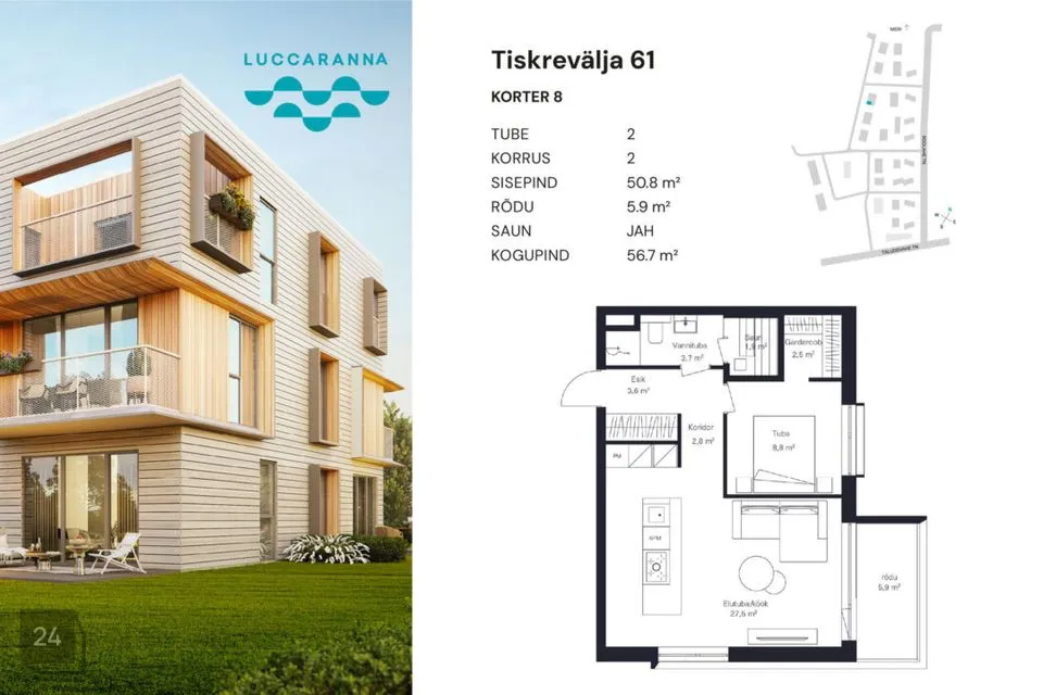 Luccaranna teeb eriliseks asukoht mere ääres, looduses, kuid linnale lähedal. Avarad rõdude ja terrassidega kodud, majadevahelised autovabad puhkealad, spordilinnak ja mänguväljakud. TULE VAATAMA!
