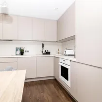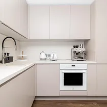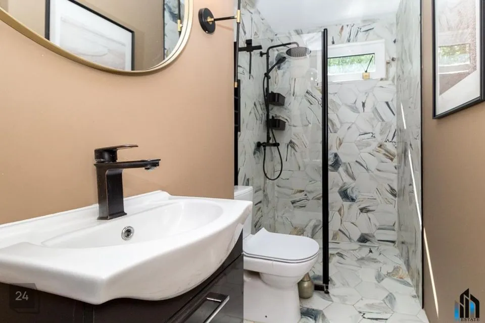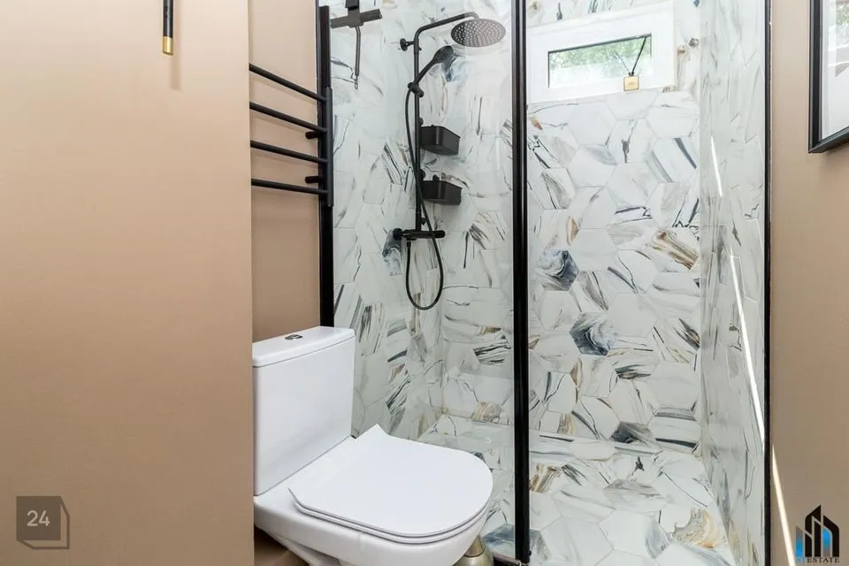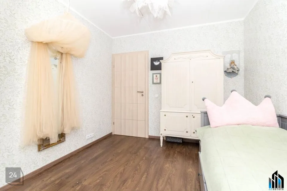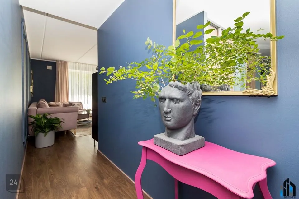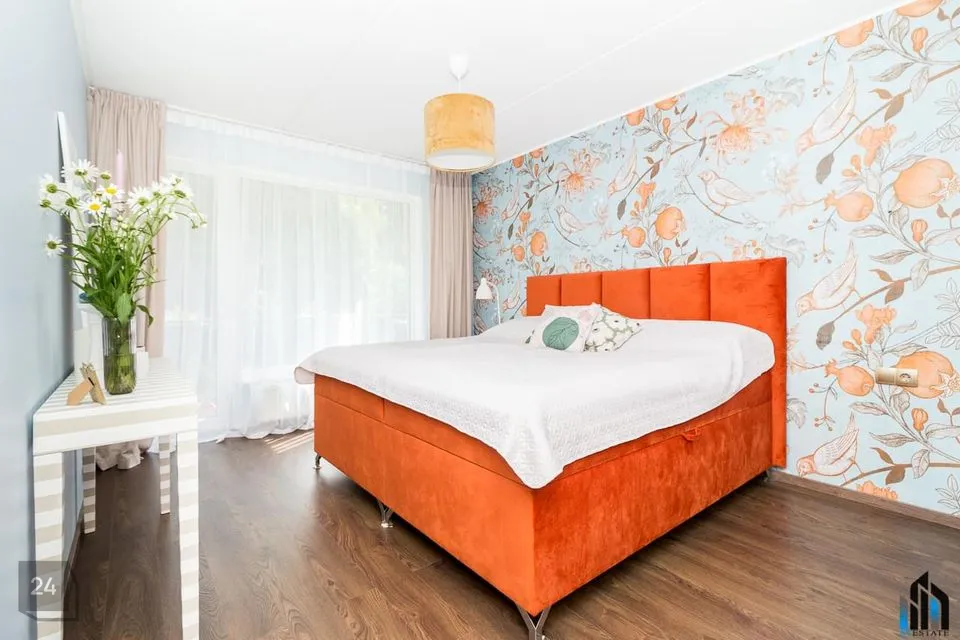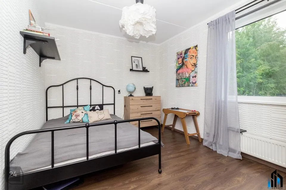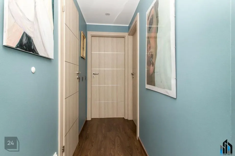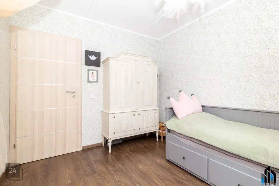 Due to its corner location, privacy is ensured, and large windows provide spaciousness and light throughout the day. No neighboring house windows are visible - only greenery can be seen. Several large built-in wardrobes add to the compactness.