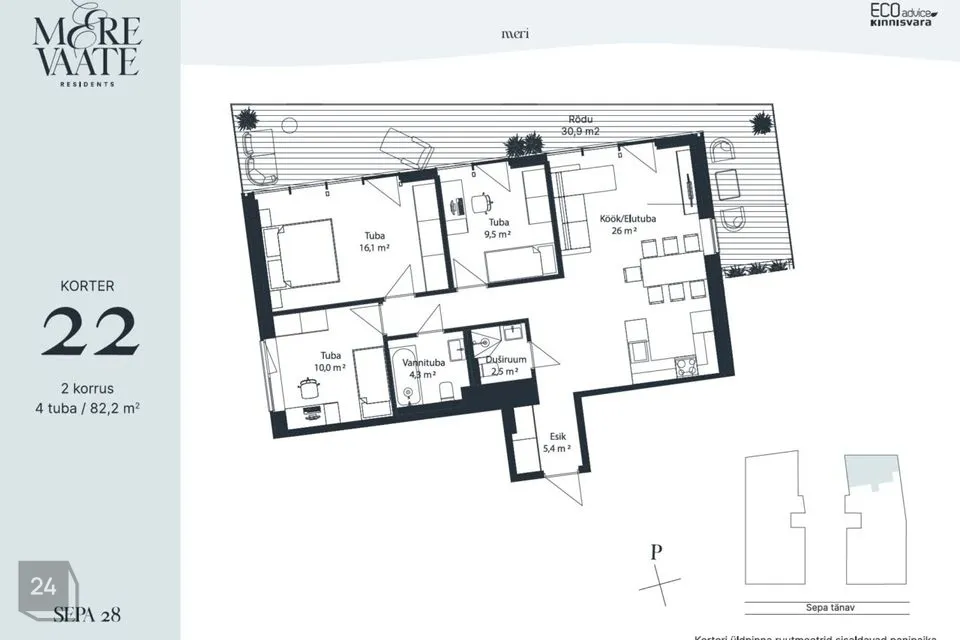 + rõdu õhtupäikese poolne ja hunnitu merevaatega, suurus 30,9 m2