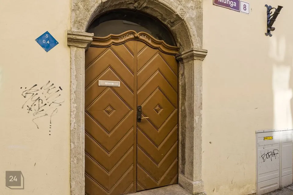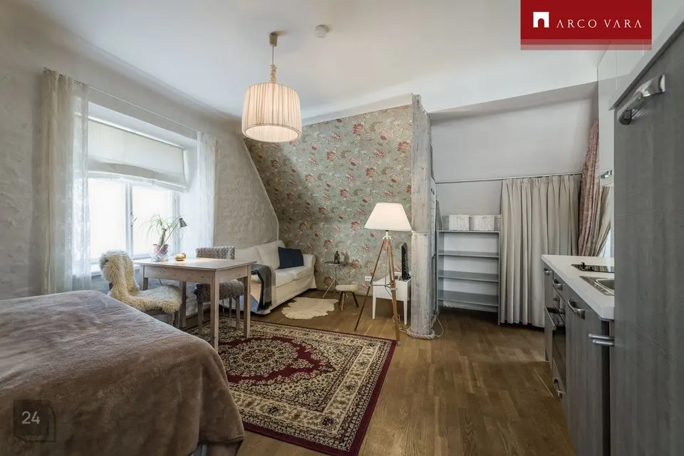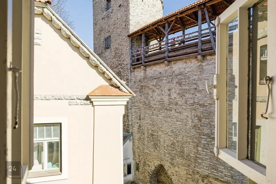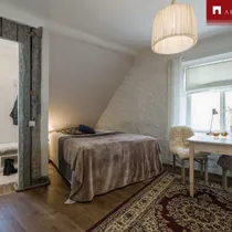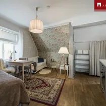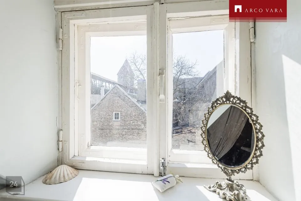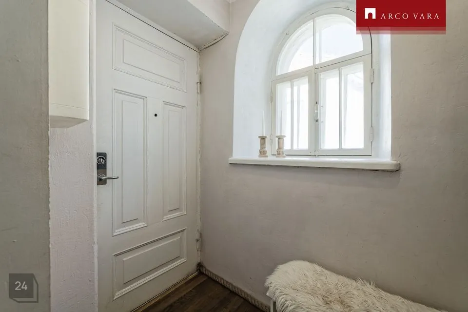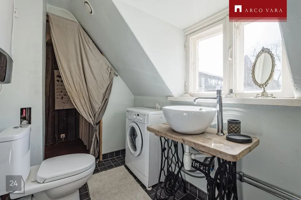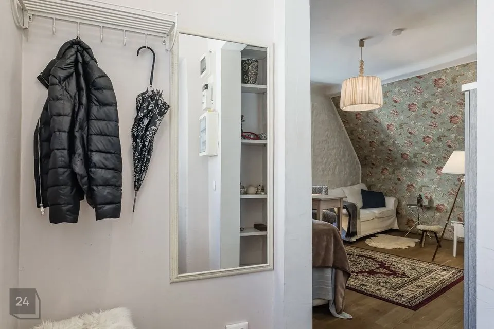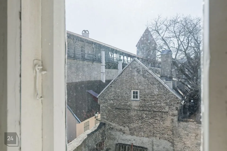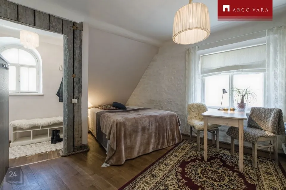 Vanalinna hõngu lisab korteri interjööris algupärane palksein, samuti kaldlaed, mille all on hea asukoht kardinaga eraldataval panipaigal.
