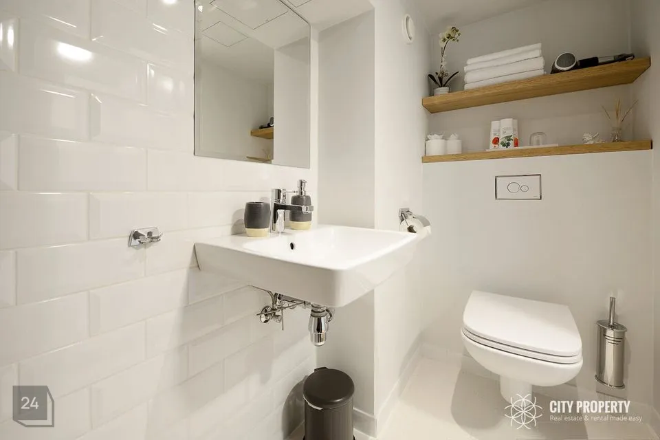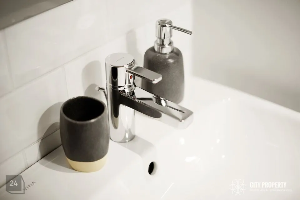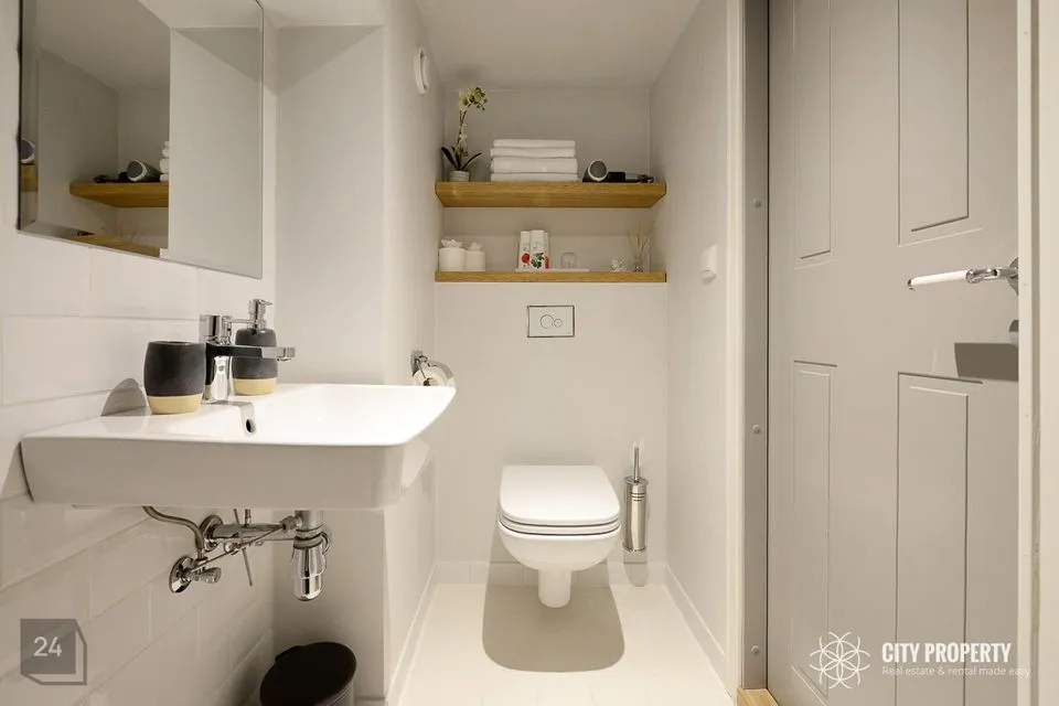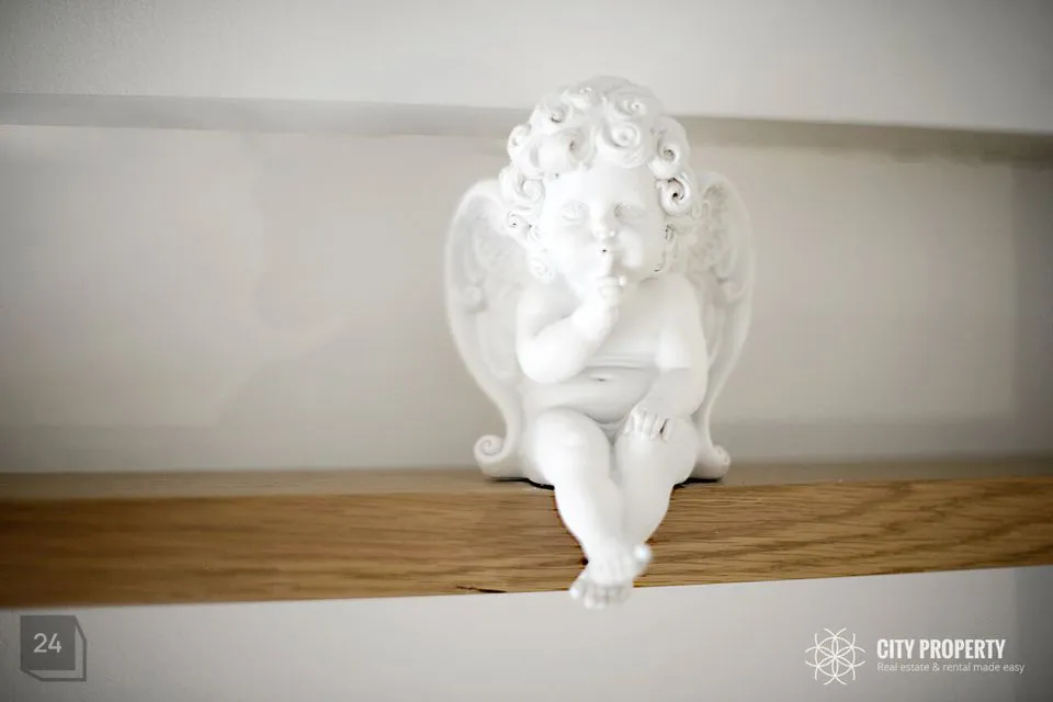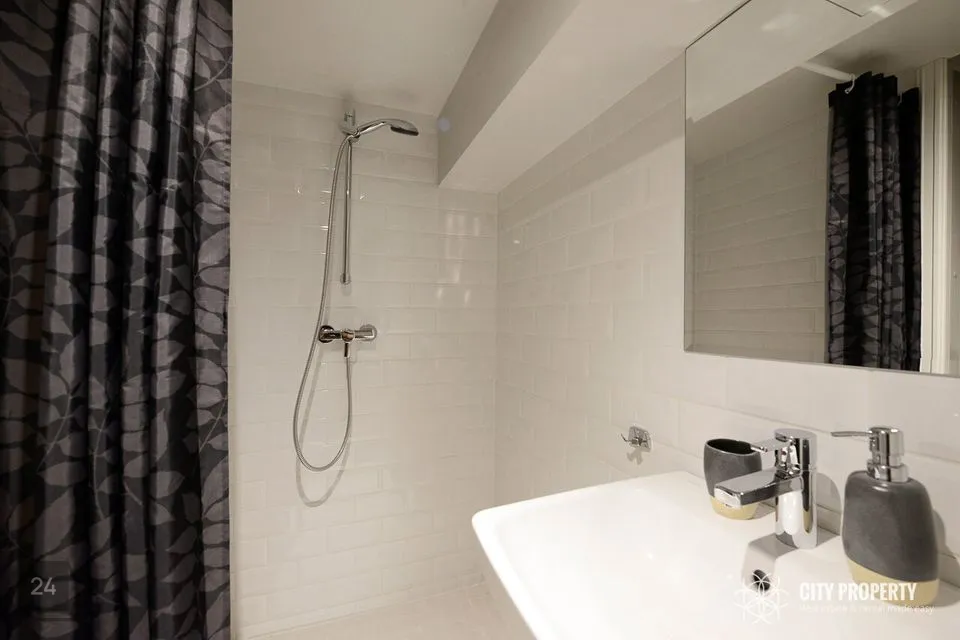 Duširuumi sisustus on hele ja minimalistlik, kasutusel on Vitra ja Kludi santehnika. Ruumi põrandale on paigaldatud elektriline põrandaküte, mis tagab sooja jalgealuse ka suveperioodil. Eluruumide põrandatel on heleda tammeviimistlusega laminaatparkett.