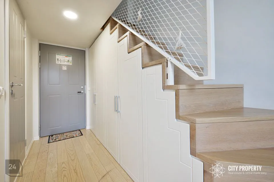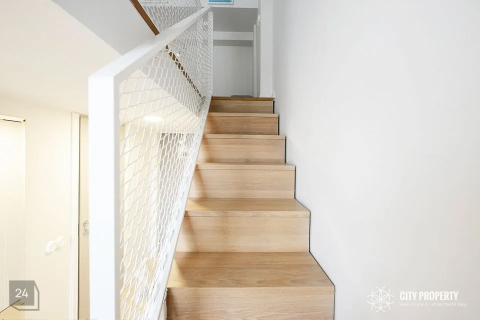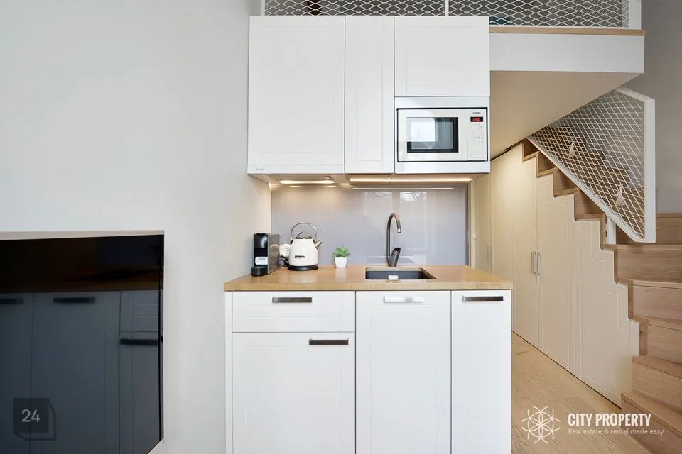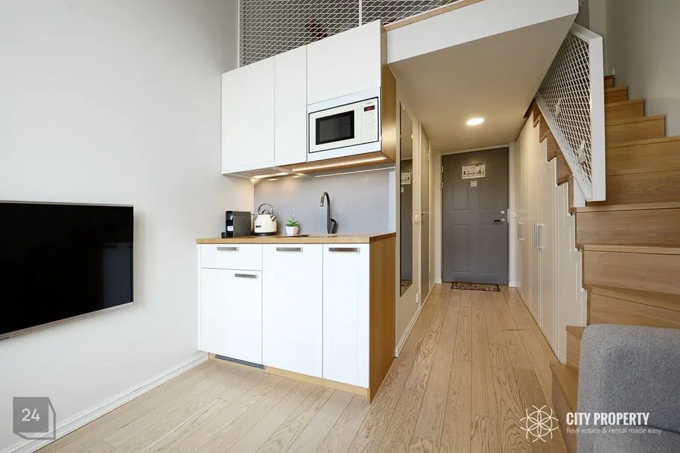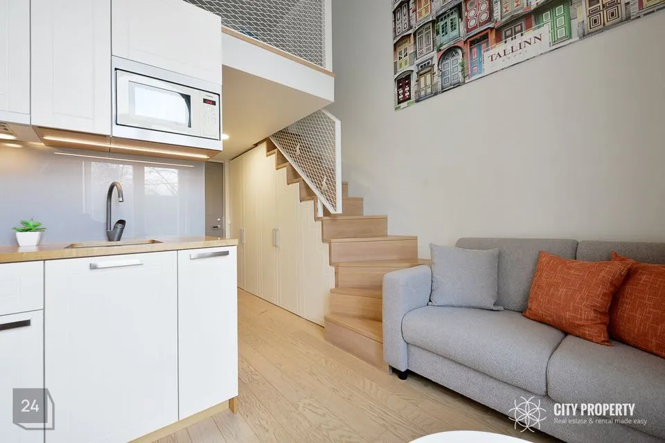 Kahetasandilise korteri põhikorruse moodustavad avatud köögiga elutuba ning duširuum koos WC-ga. Köögis on toidu valmistamiseks kasutusel miniahi ning portatiivne pliidplaat. Väga funktsionaalselt on lahendatud trepialune ala, kuhu on teostatud panipaigad ja garderoob. Trepialuses kapis on samuti valmidus pesumasina ühendamiseks, paigaldatud on veeühendus ja äravool. Rõdutasandi pind on planeeritud magamiseks, sealne lae kõrgus ca1,7m. Aknakatteks on pimendava funktsiooniga ruloo.