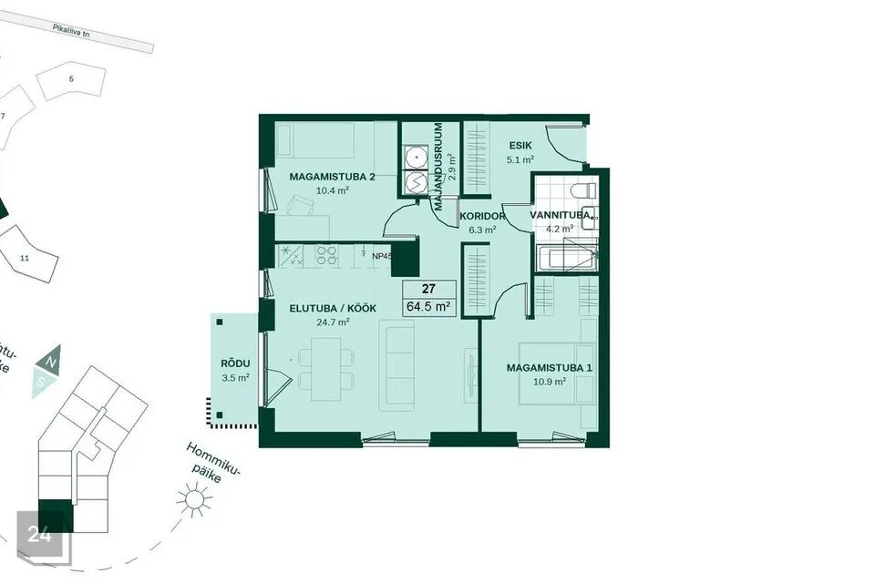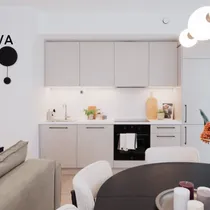 Elutuba ja köök (24,7 m²) on avar ning valgusküllane, pakkudes mitmekülgseid sisustusvõimalusi. Köök on funktsionaalne ja modernse lahendusega, sobides nii igapäevasteks toimetusteks kui ka suuremateks koosviibimisteks. Rõdu (3,5 m²) pakub ideaalset paika hommikukohvi nautimiseks.