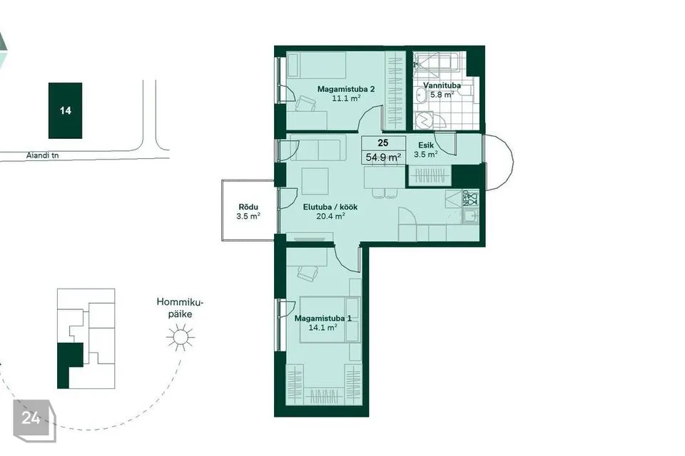 Aiandi 14 korterelamu on modernsed ja funktsionaalsed. Soojustagastusega ventilatsioonisüsteem ja hea soojapidavus tagavad uues kodus kvaliteetse sisekliima ja madalad kodukulud. Uuele elamule omistatakse energiatõhus B-energiaklass.