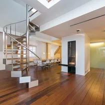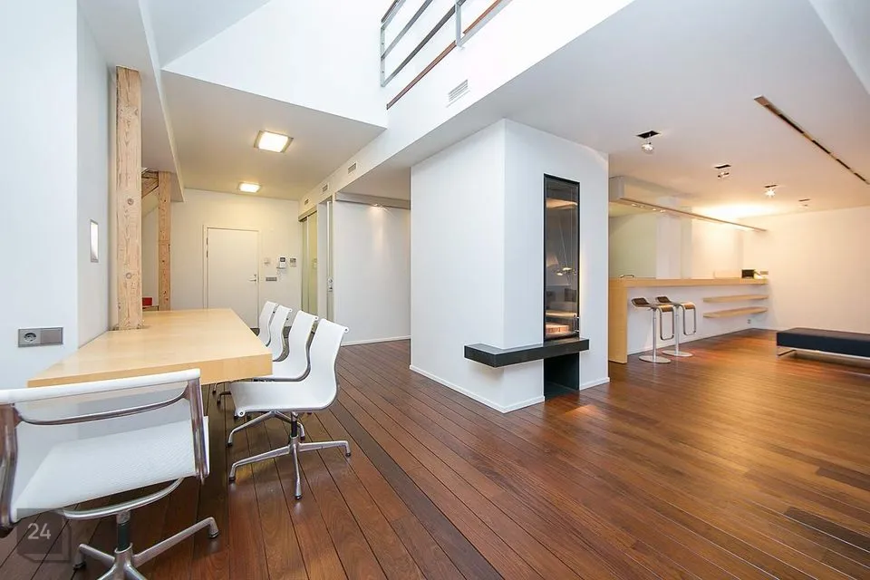 Korteri esimesel korrusel on väga avar ja kõrge laega avatud köök elutoaga, mille akendest avaneb kaunis vaade Tallinna Raekoja platsile. Elutoas paikneb päris puitküttega kamin.